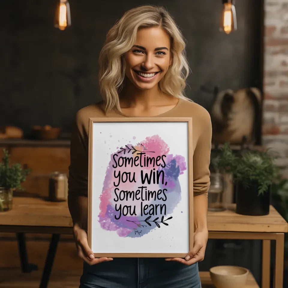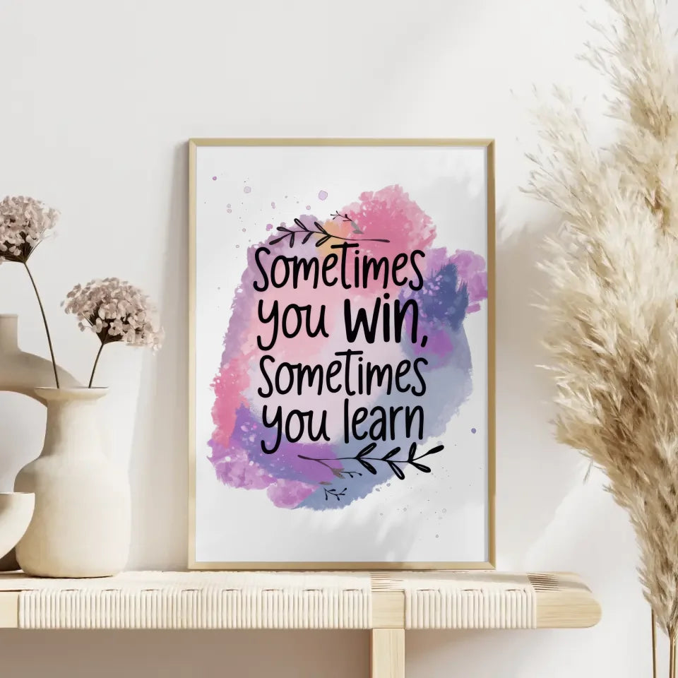 Entdecken Sie unser einzigartiges motivierendes Zitat Poster mit Aquarell Hintergrund in Rosa Lila Blau. Dieses wunderschöne Spruchbild bringt nicht nur Farbe in Ihre Räume, sondern inspiriert auch mit seinem bedeutungsvollen Spruch: 'Manchmal gewinnt man, manchmal lernt man“. Die digitale Illustration in sanften Rosa-, Lila- und Blautönen schafft eine harmonische Atmosphäre, die ideal für jedes Zuhause oder Büro ist. Die zarten Sprenkel und der filigrane Blätterzweig verleihen dem Poster eine frische Note, die für ein Gefühl der Ruhe und Positivität sorgt. Jedes Poster wird mit großer Sorgfalt und Liebe zum Detail gestaltet, um die perfekte Wanddekoration zu bieten. Ob im Wohnzimmer, Schlafzimmer oder Arbeitsbereich – dieses Motivationsposter ist eine hervorragende Wahl, um Ihre Wände zum Strahlen zu bringen und eine ermutigende Botschaft zu verbreiten. Verleihen Sie Ihrem Raum mit diesem beeindruckenden Kunstwerk einen stilvollen Look. Bestellen Sie jetzt unser motivierendes Zitat Poster und setzen Sie ein inspirierendes Statement in Ihrem Zuhause!