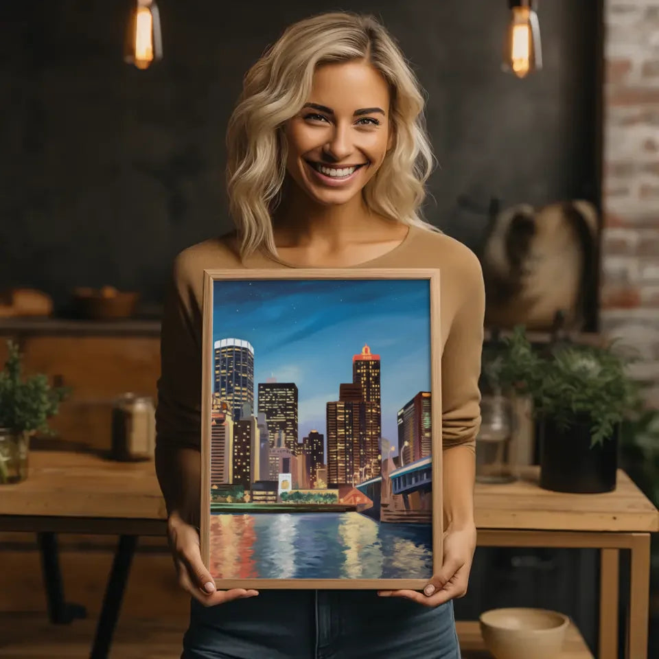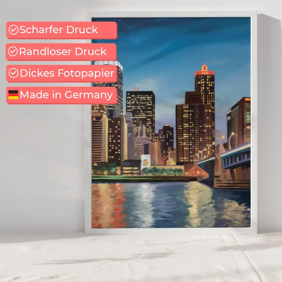 Verleihen Sie Ihrem Raum mit unserem Nachthimmel-Poster einen Hauch von Eleganz und urbanem Flair. Jedes Element in diesem Poster erzählt eine Geschichte und lädt dazu ein, sich in die lebendige Stadtlandschaft zu vertiefen. Warten Sie nicht länger – kaufen Sie noch heute Ihr Nacht Skyline Poster und erleben Sie die faszinierende Schönheit der nächtlichen Großstadt!