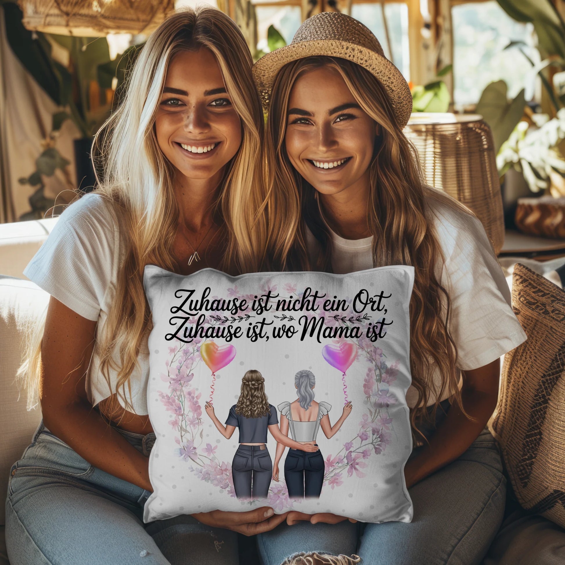 Überrasche Deine Mama zum Muttertag mit einem personalisierten Kissen, das Emotionen trägt und den Alltag verschönert. Das Namen Kissen für Mama - 2 Frauen Clipart, Hintergrund, Wunschtext personalisierbar verbindet liebevolle Gestaltung mit individueller Note und ist ideal als Geschenk für Mama zum Muttertag. Auf dem Design steht der schöne Spruch: Zuhause ist nicht ein Ort Zuhause ist wo Mama ist. Du kannst 2 Clipart Frauen, Namen, Hintergrundbild und eigenen Spruch oder Wunschtext personalisieren, sodass jedes Kissen einzigartig wird.