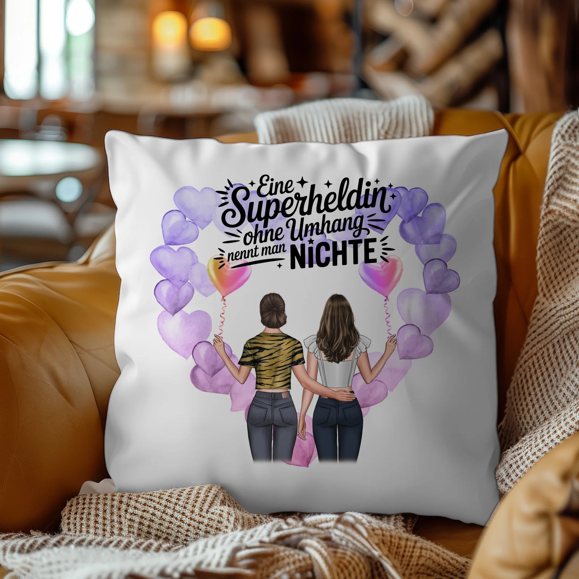 Du kannst folgende Elemente anpassen: 2 Clipart Frauen, Namen, Hintergrundbild & Eigener Spruch oder Wunschtext. Ideal als personalisiertes Kissen für Nichte und Lehrerin, mit individuellem Motiv und persönlicher Botschaft.