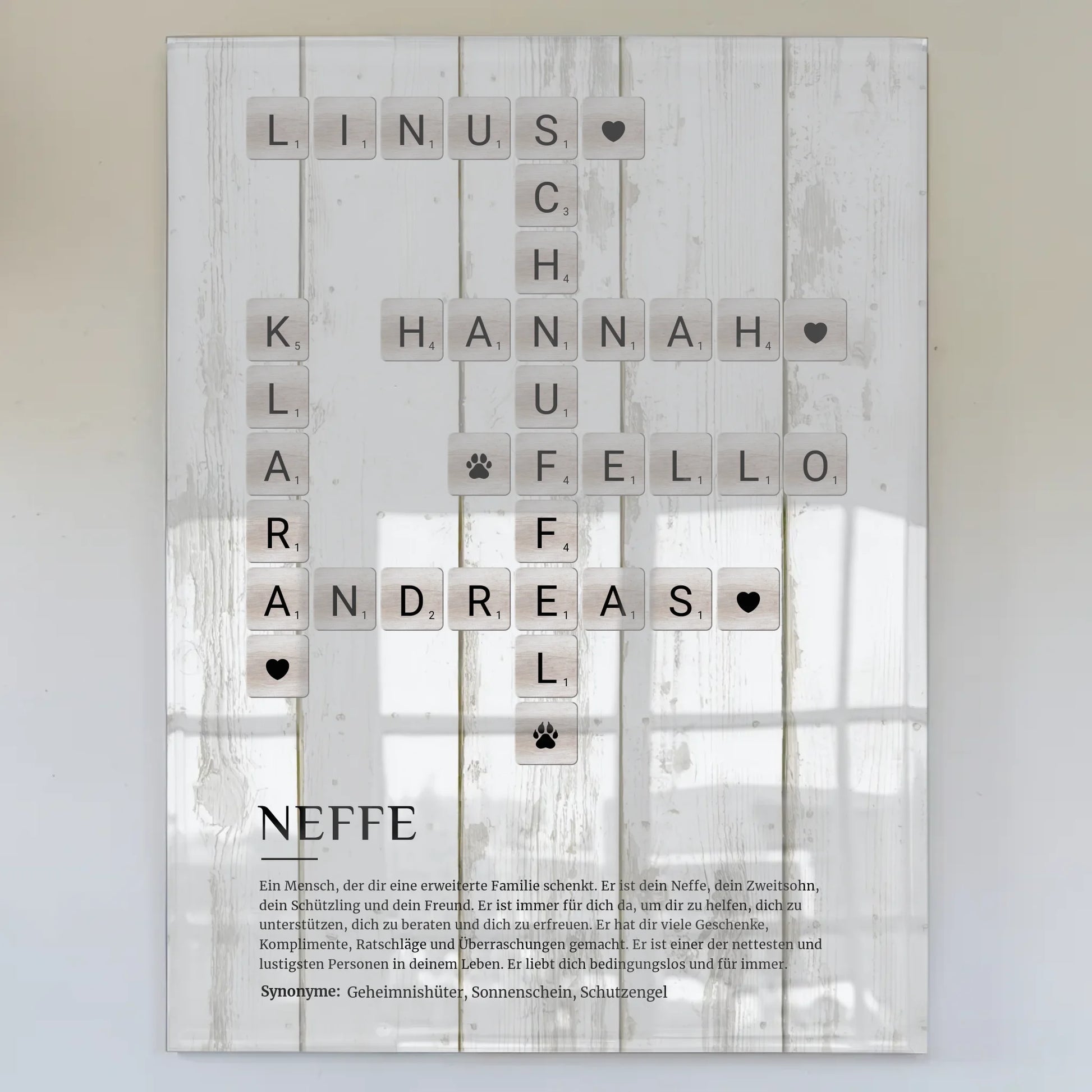 Überrasche Deinen Neffen mit einem einzigartigen und persönlichen Geschenk: dem Neffe Definition Acrylglas Bild Poster Kreuzworträtsel. Dieses außergewöhnliche Kunstwerk ist nicht nur ein schönes Deko-Element, sondern auch eine kreative Art, die besondere Beziehung zu Deinem Neffen auszudrücken. Mit der Möglichkeit, ganz nach Deinen Wünschen Namen in das Kreuzworträtsel einzufügen und das Hintergrundbild individuell anzupassen, wird dieses Geschenk garantiert zum Hingucker.