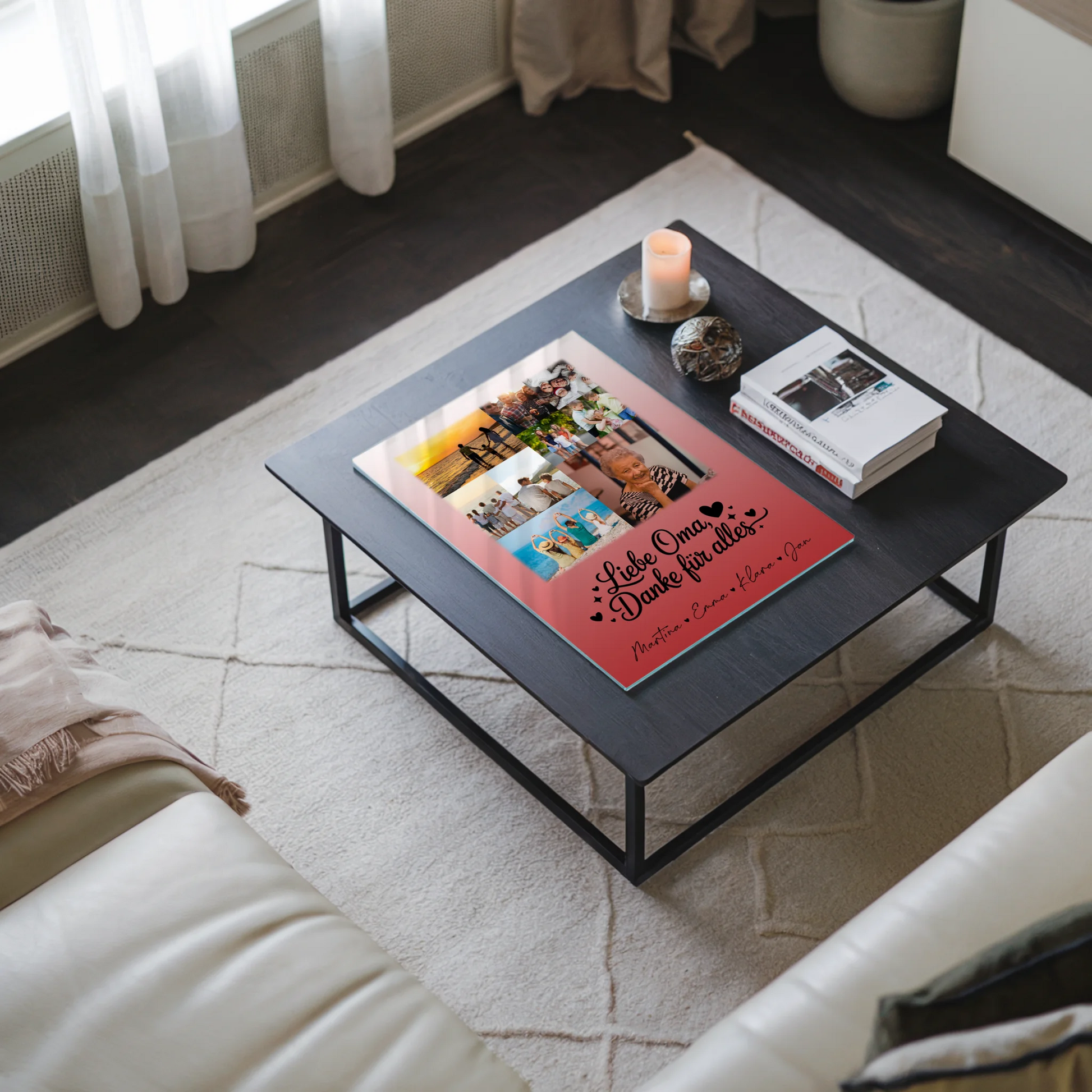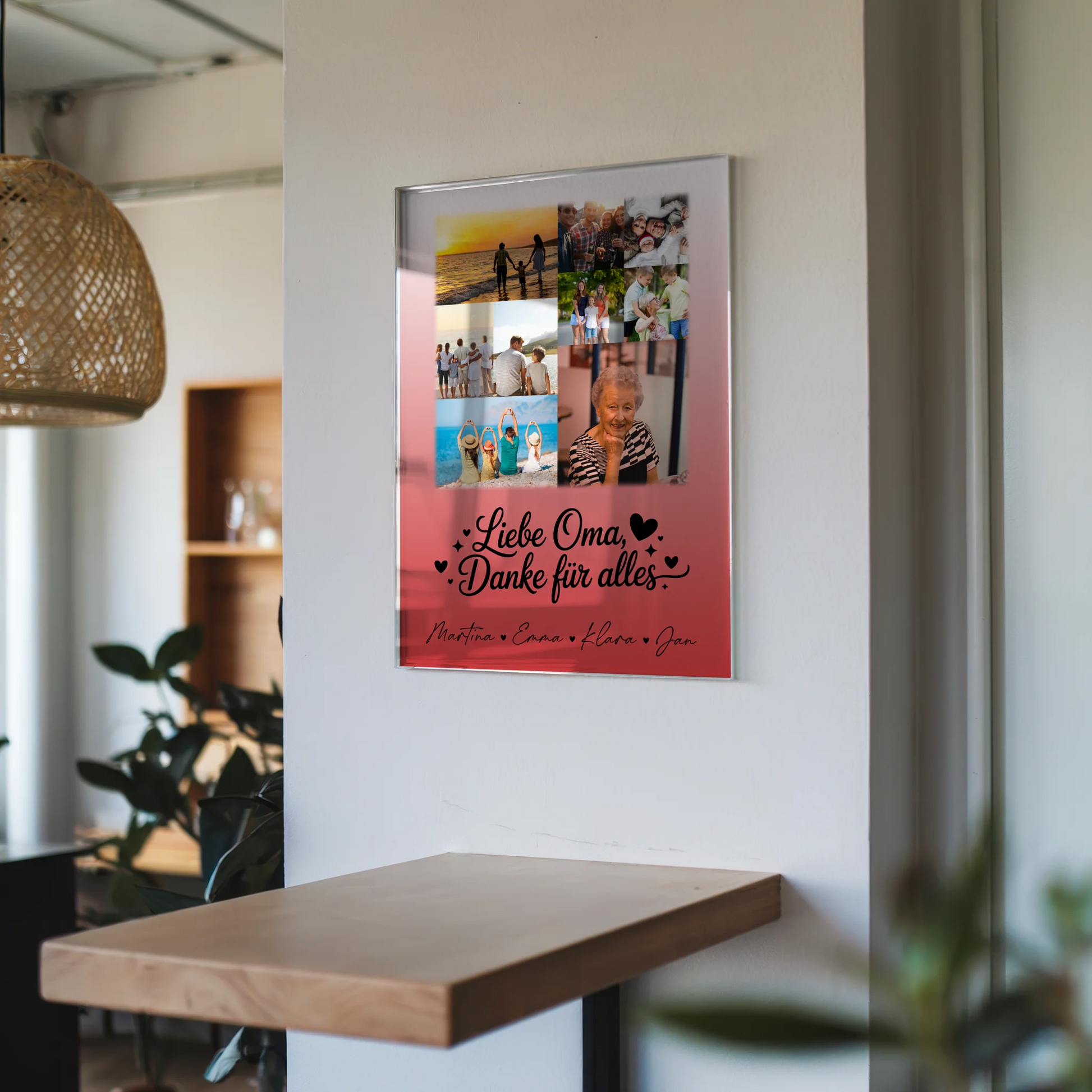 Überrasche deine liebe Oma mit einem einzigartigen und persönlichen Geschenk, das ihre Herzen höher schlagen lässt. Das Oma Plakat Acrylglas Bild mit 9 Fotos Liebe Oma Danke für alles ist die perfekte Fotocollage für Oma, die deine schönsten Momente und liebevollen Erinnerungen stilvoll vereint. Du kannst dieses besondere Geschenk ganz individuell gestalten, indem du 9 Fotos, einen eigenen Spruch oder Wunschtext sowie die Namen deiner Liebsten hinzufügst. Das hochwertige Acrylglas sorgt für eine elegante Optik und macht das Bild zu einem echten Blickfang in jedem Zuhause deiner Oma. Ob zum Muttertag, Geburtstag oder einfach nur, um Danke zu sagen – dieses personalisierte Geschenk zeigt deiner Oma, wie viel sie dir bedeutet. Mit dem liebevollen Spruch „Liebe Oma, Danke für alles“ wird das Geschenk zu einem emotionalen Highlight. Mach deiner Oma eine Freude, die sie nie vergessen wird, und schaffe ein einzigartiges Erinnerungsstück, das sie täglich an eure besondere Beziehung erinnert.