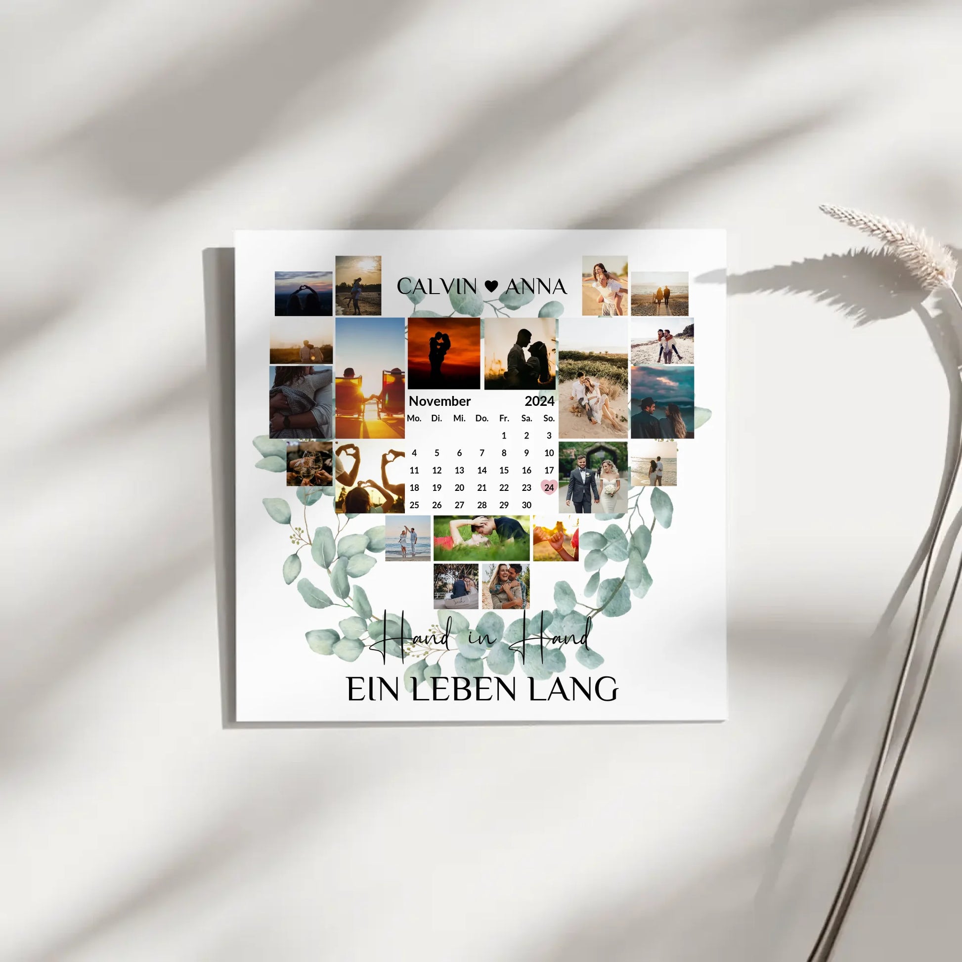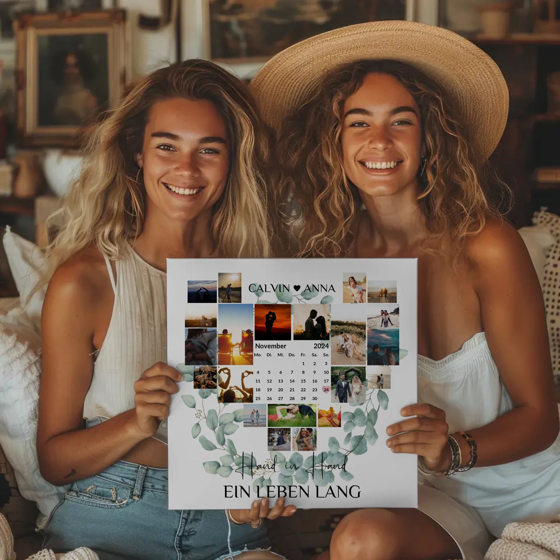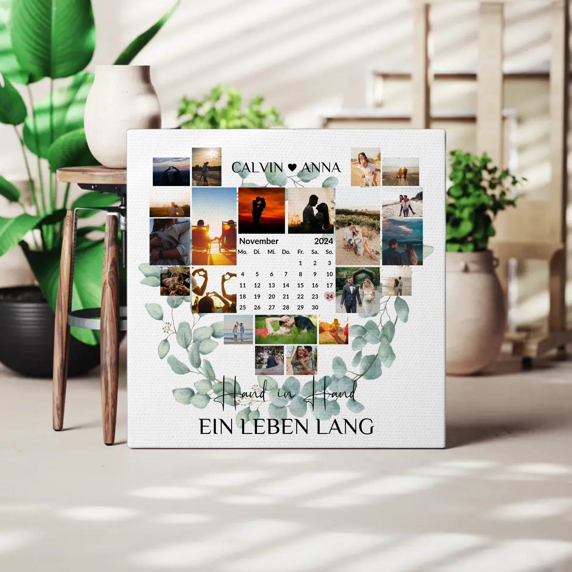 Entdecke unsere bezaubernde Paar Fotoleinwand Fotocollage Hand In Hand Ein Leben Lang – das perfekte personalisierte Geschenk für deine Liebsten! Diese einzigartige Leinwand bietet dir die Möglichkeit, über 20+ Fotos, Namen und das Datum eurer schönsten Erlebnisse individuell zu gestalten. Der liebevolle Spruch 'Hand In Hand Ein Leben Lang' rundet das Design ab und bringt eure Verbundenheit zum Ausdruck.
