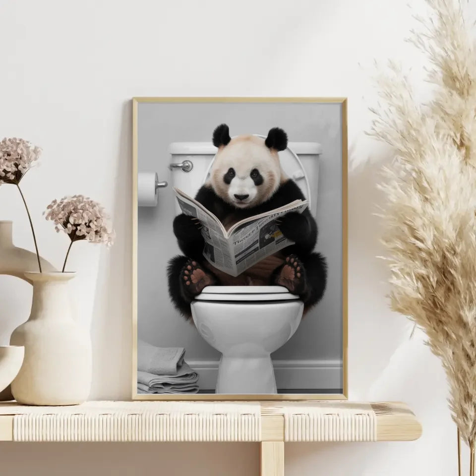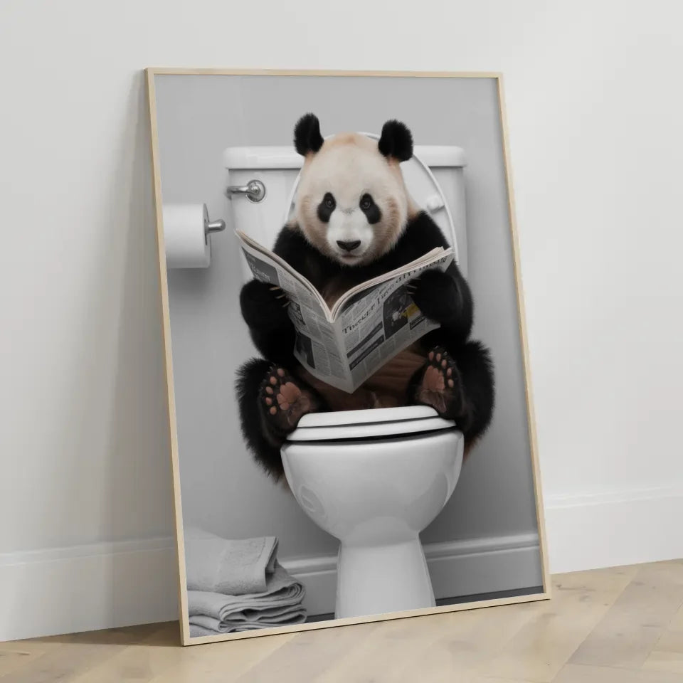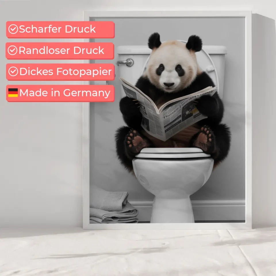 Entdecken Sie unser einzigartiges Panda Poster auf Toilette mit Zeitung lesen, das in jede Wohnung einen Hauch von Humor und Charme bringt. Dieses witzige Wandbild gehört zur Kategorie der lustigen Klo Sprüche und sorgt garantiert für Lacher bei Ihren Gästen. Der niedliche Panda, der entspannt auf der Toilettenschüssel sitzt und eifrig eine Zeitung liest, zieht alle Blicke auf sich und verleiht Ihrem Badezimmer eine besondere Note.