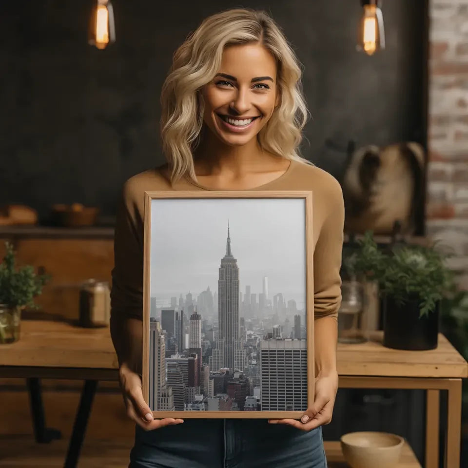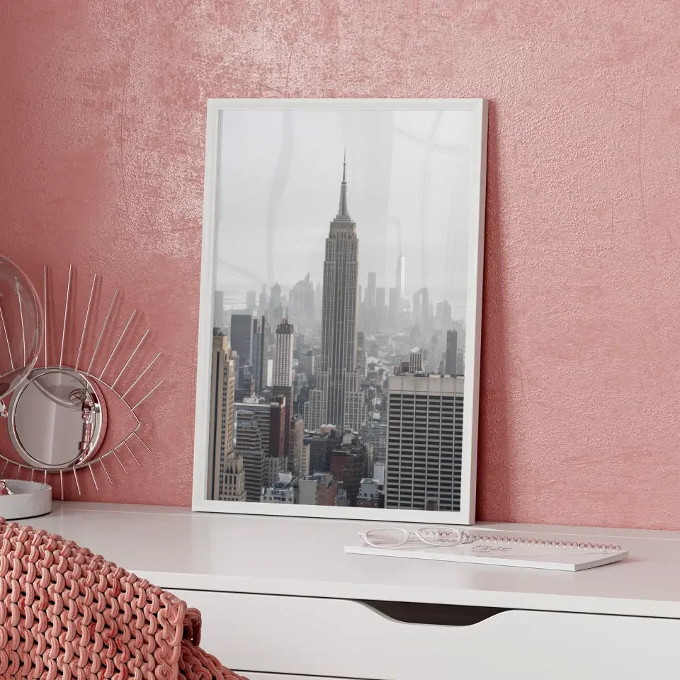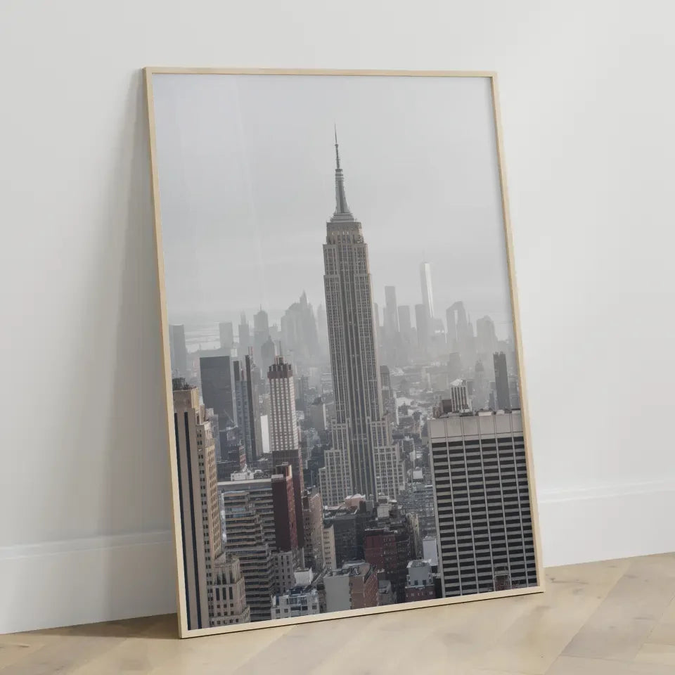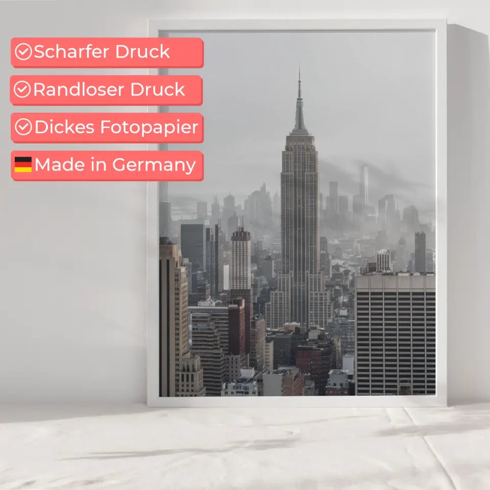 Erleben Sie mit unserem beeindruckenden Poster 'Panoramablick auf Stadt mit Empire State Buildingâ eine faszinierende Darstellung urbaner Architektur. Dieses Kunstwerk zeigt das ikonische Empire State Building, das majestĂ€tisch in der Mitte des Stadtbildes thront. Die Art-DĂ©co-Architektur des GebĂ€udes ist atemberaubend und zieht alle Blicke auf sich, wĂ€hrend eine Vielzahl von weiteren Wolkenkratzern die Skyline umrahmt. Die unterschiedlich hohen GebĂ€ude verleihen der Stadt eine dynamische Struktur und zeigen die beeindruckende Vielfalt der Architektur. Das Poster strahlt eine besonders ruhige und fast Ă€therische AtmosphĂ€re aus, die durch den nebligen Hintergrund verstĂ€rkt wird. Dieses Stadtbild ist nicht nur ein dekoratives Element, sondern auch eine Hommage an die moderne Metropole und eignet sich perfekt fĂŒr jedes Zuhause oder BĂŒro. Tauchen Sie ein in die Magie dieser urbanen Landschaft und bringen Sie mit unserem Poster ein StĂŒck Stadtleben in Ihre vier WĂ€nde.