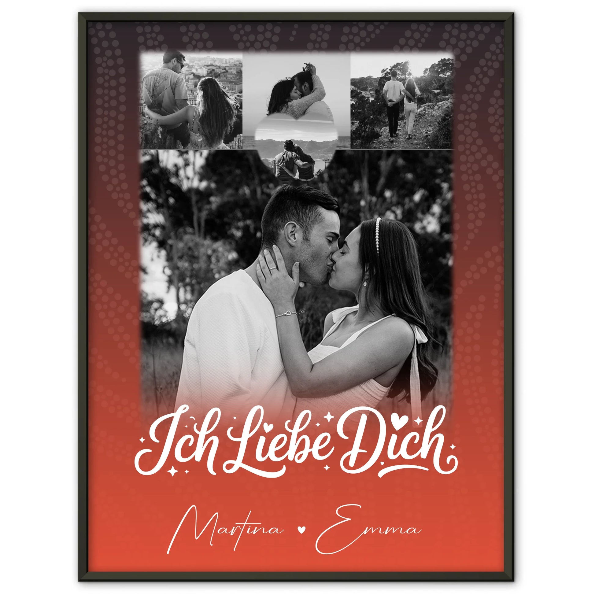 Das stilvolle Design kombiniert den romantischen Schriftzug Te Amo mit euren persönlichen Bildern. Der liebevolle Spruch Ich liebe Dich ist ebenfalls dezent in das Design integriert und unterstreicht die romantische Botschaft. Das zentrale Herz-Foto wird zum emotionalen Mittelpunkt und fängt die Essenz eurer Beziehung ein. Dieses Fotogeschenk ist eine wunderschöne Erinnerung an eure gemeinsame Zeit.