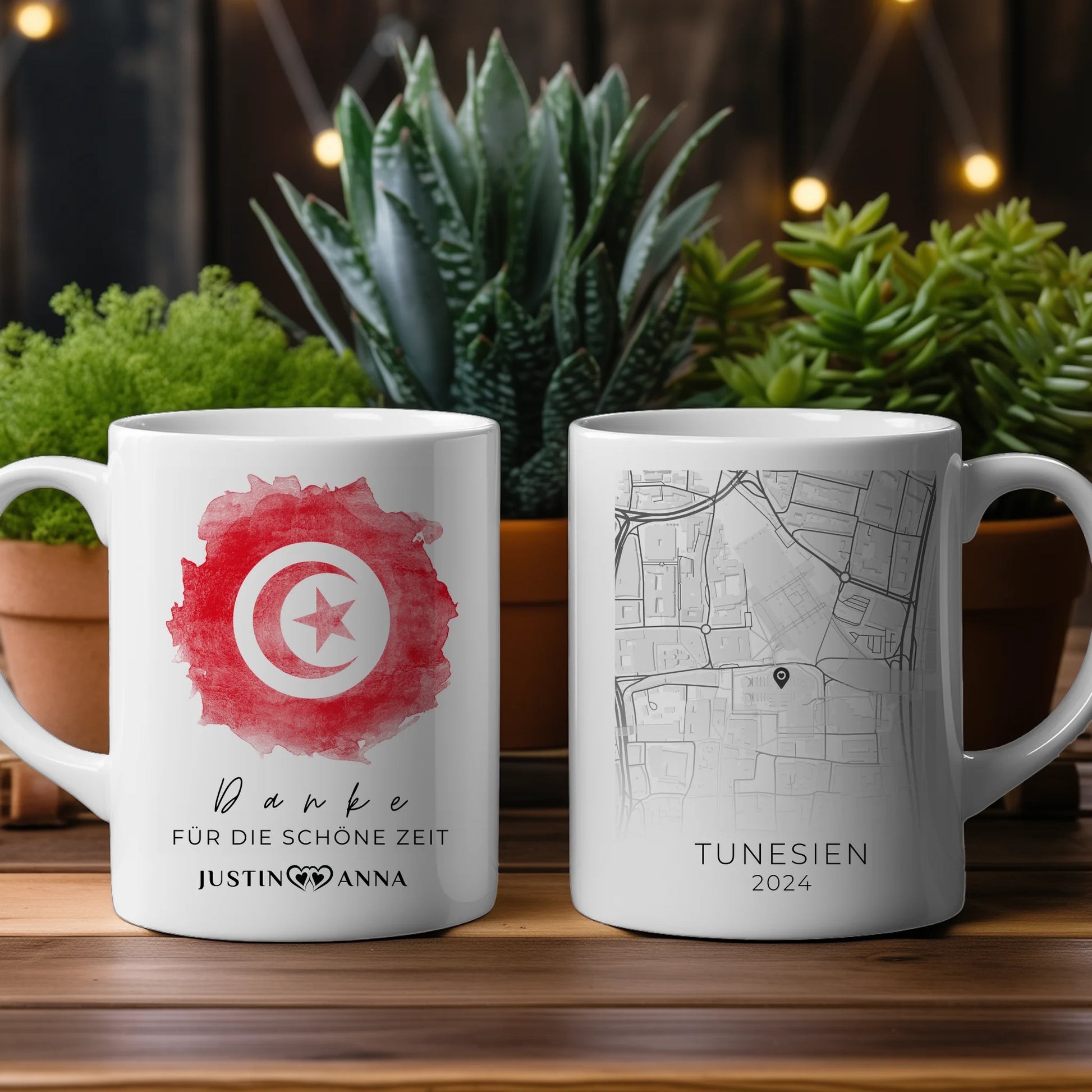 Du möchtest mal wieder etwas einzigartiges verschenken? Unsere Pärchen Tasse Urlaubs Erinnerung Tunesien Stadtkarte ein super schickes personalisiertes Geschenk.
