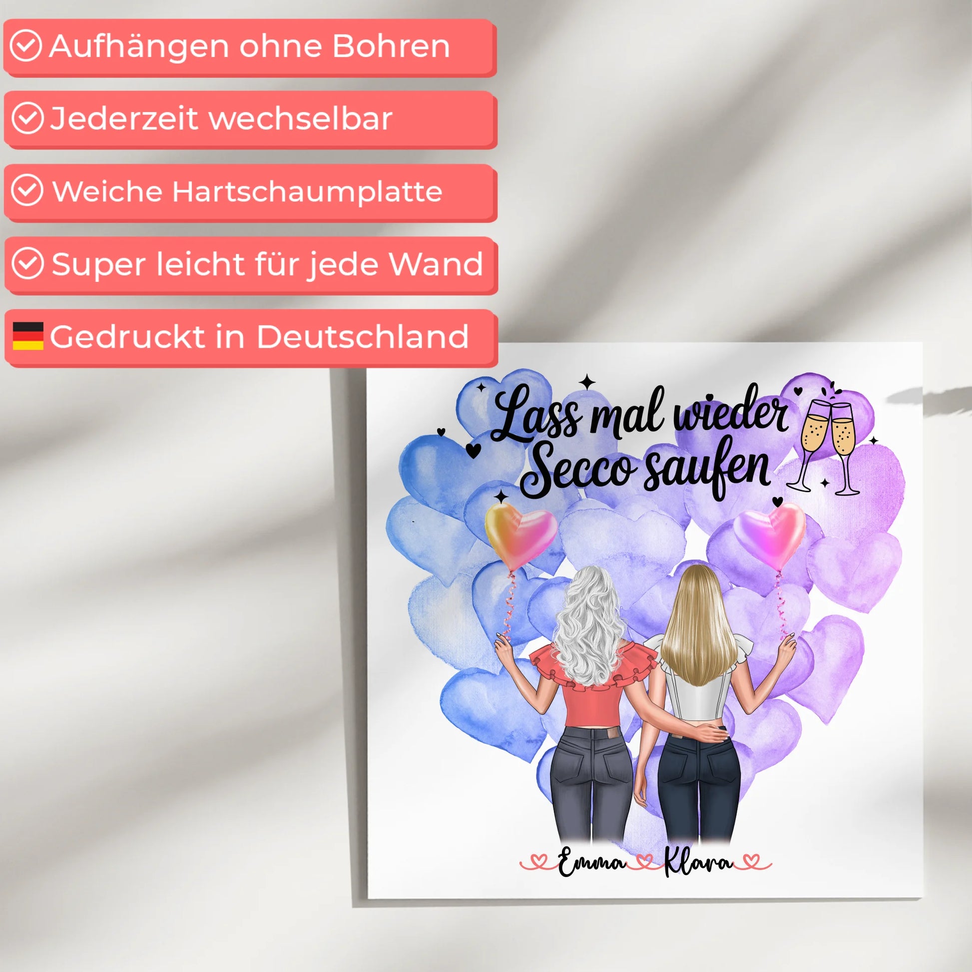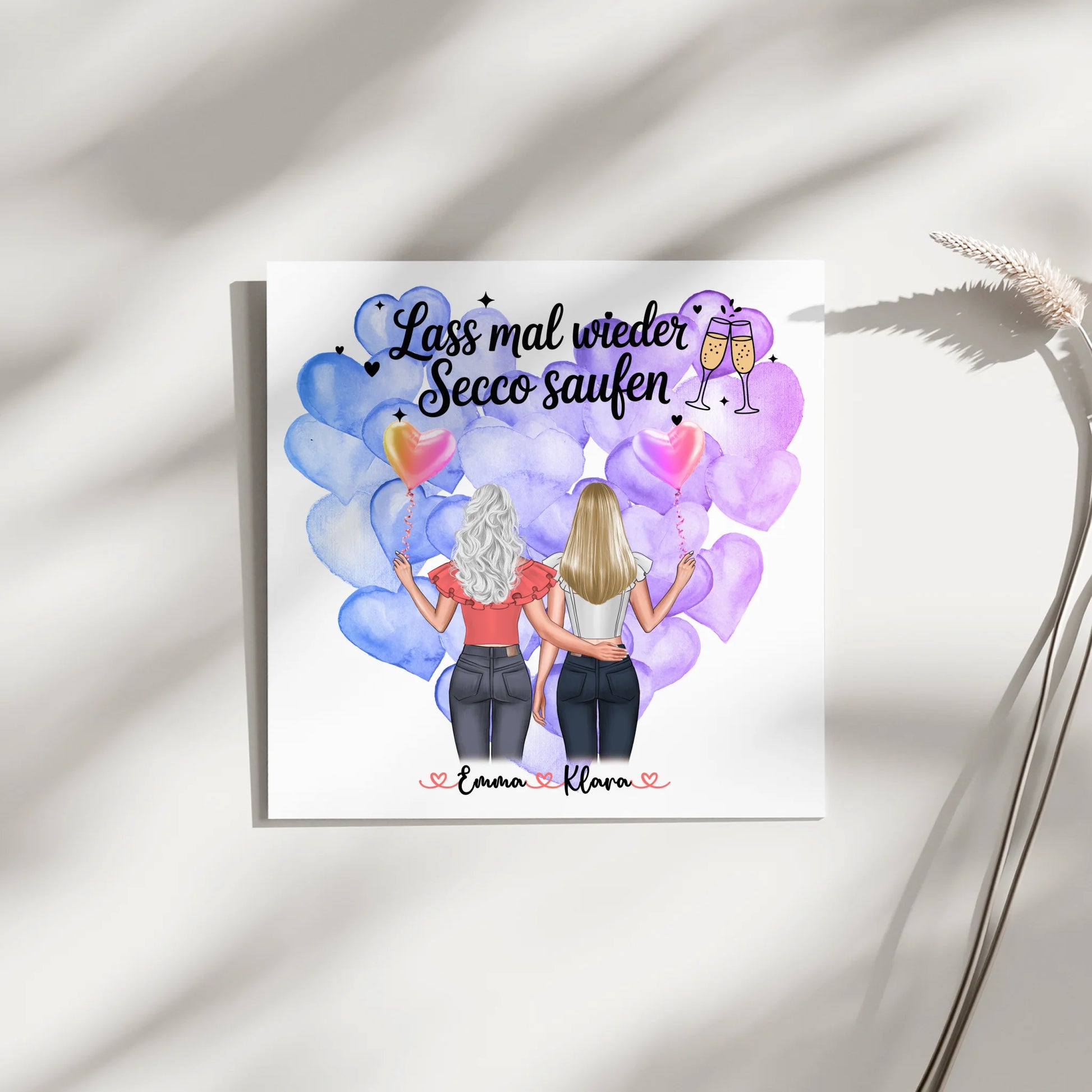 Du kannst 2 Clipart Frauen, die Namen, das Hintergrundbild und einen eigenen Spruch oder Wunschtext anpassen. Auf dem Beispieldesign steht der Spruch Lass mal wieder Secco saufen, den du behalten oder gegen einen von über 100 Sprüchen beziehungsweise deinen eigenen Wunschtext tauschen kannst.