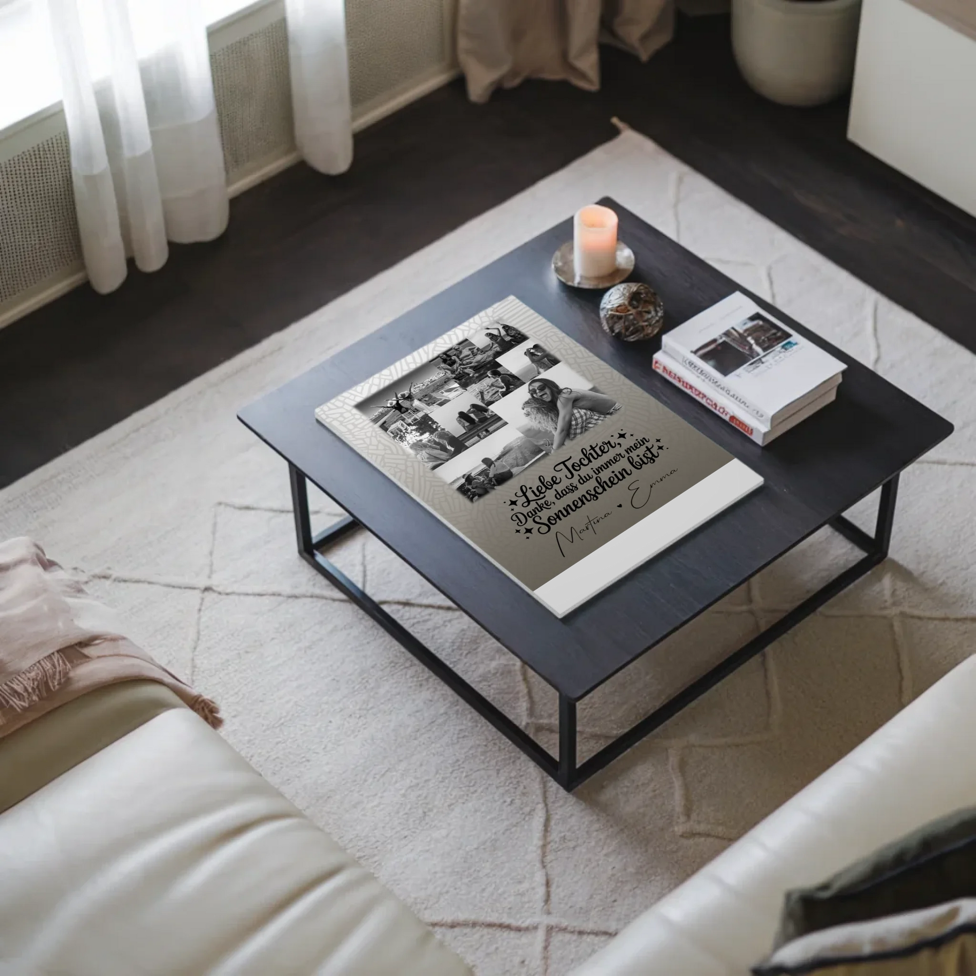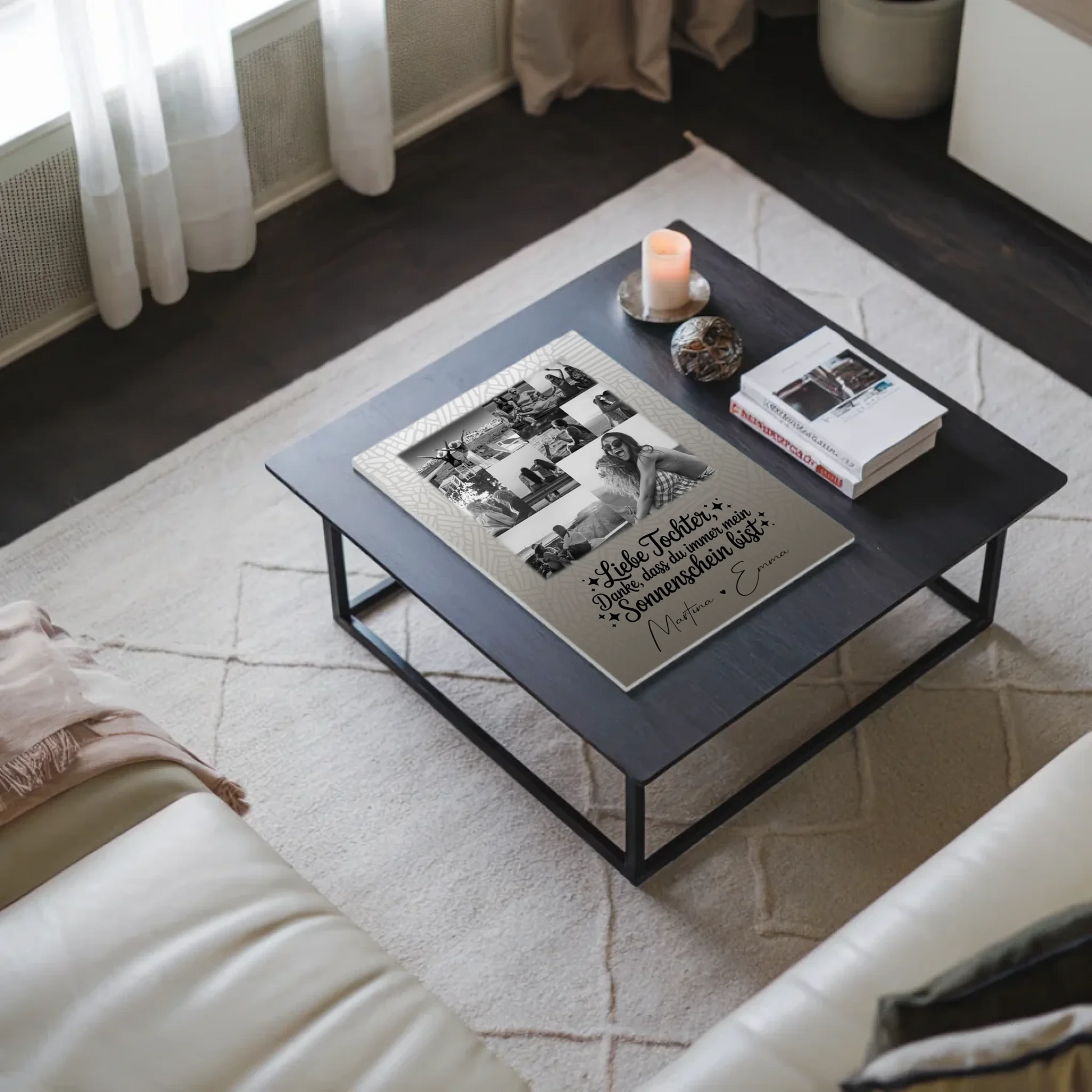Entdecke das perfekte Geschenk für deine Tochter mit unserem Personalisierbares Fotoboard Magnet Wandbild mit 9 Fotos Danke mein Sonnenschein Schwarz-Weiß. Dieses einzigartige Wandbild bietet dir die Möglichkeit, eine individuelle Fotocollage für Tochter zu gestalten, die garantiert für Freude sorgt. Du kannst bis zu 9 Fotos, einen eigenen Spruch oder Wunschtext sowie die Namen personalisieren, um ein ganz persönliches Geschenk zu kreieren. Das elegante Schwarz-Weiß-Design mit dem liebevollen Spruch „Liebe Tochter, Danke, dass du immer mein Sonnenschein bist“ macht dieses Wandbild zu einem besonderen Highlight in jedem Raum. Ob zu Geburtstagen, Jubiläen, oder einfach als liebevolle Überraschung – dieses Geschenk ist für jeden Anlass geeignet und zeigt deiner Tochter, wie viel sie dir bedeutet. Das Personalisierbares Fotoboard Magnet Wandbild mit 9 Fotos Danke mein Sonnenschein Schwarz-Weiß ist die ideale Wahl, um deine Wertschätzung auf kreative und persönliche Weise auszudrücken. Überrasche deine Tochter mit einem individuellen Geschenk, das sie immer an eure besondere Beziehung erinnert.