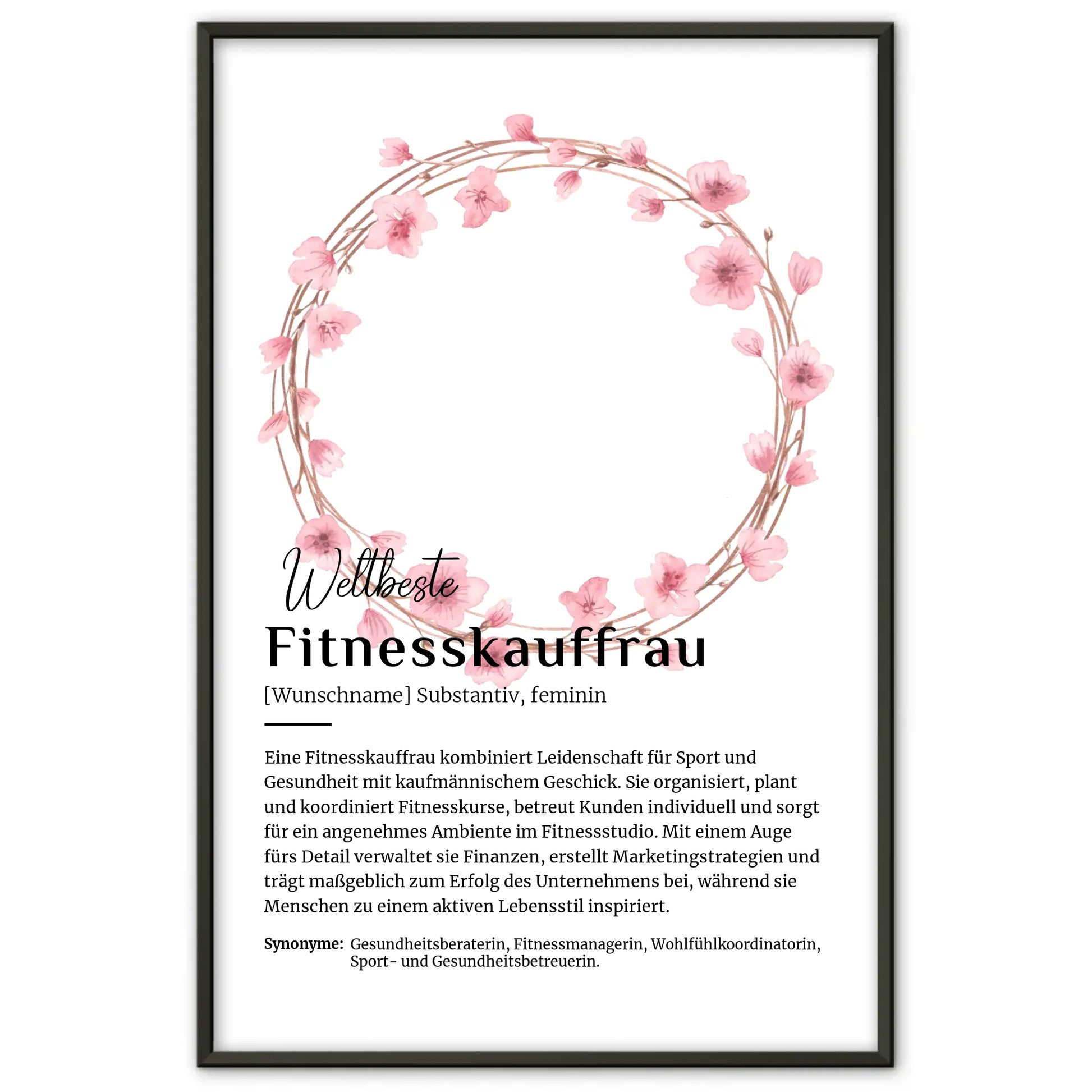 Entdecke das einzigartige Personalisierbare Poster Definition Fitnesskauffrau mit Namen, das perfekt für alle Fitnessbegeisterten ist! Dieses stilvolle Definitionsposter ist nicht nur ein echter Hingucker, sondern auch eine wunderbare Möglichkeit, Deine Leidenschaft für den Beruf der Fitnesskauffrau oder des Fitnesskaufmanns zu zeigen. Mit diesem Poster kannst Du Deinen Raum individuell gestalten und gleichzeitig Deine Liebe zum Sport ausdrücken.