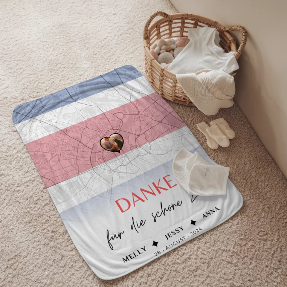 Du hast die Möglichkeit, die Decke individuell zu gestalten: Wähle ein Foto, das besondere Erinnerungen weckt, füge eine Stadtkarte eines besonderen Ortes hinzu und personalisiere sie mit bis zu 5 Namen sowie einem eigenen Spruch oder Wunschtext. So wird jede Decke zu einem Unikat, das aus dem Herzen spricht.