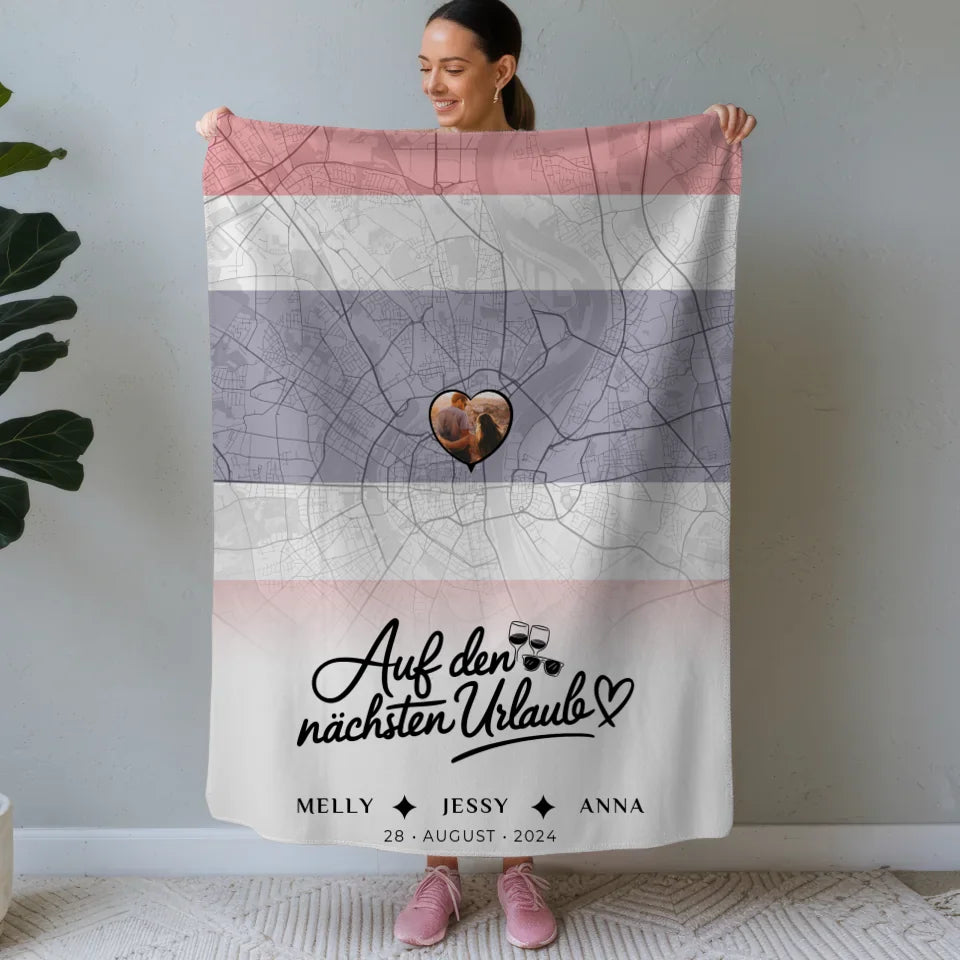 Dieses einzigartige Geschenk lässt sich individuell gestalten. Du hast die Möglichkeit, bis zu 5 Namen sowie einen eigenen Spruch oder Wunschtext auf der Decke anzubringen. Mit dem liebevollen Spruch 'Auf Den Nächsten Urlaub' wird die Decke noch persönlicher und bringt immer wieder schöne Erinnerungen zurück. Ob zum Geburtstag, zu Weihnachten oder einfach als nette Aufmerksamkeit – diese Decke ist das ideale Geschenk für jeden Anlass.