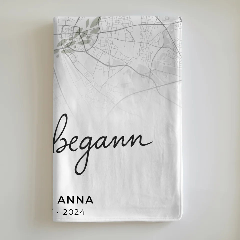 Gestalte deine Decke ganz individuell! Wähle dein persönliches Foto aus, füge eine Stadtkarte mit einem besonderen Ort hinzu und ergänze die Decke mit euren Namen sowie einem eigenen Spruch oder Wunschtext. So wird jede Decke zu einem einzigartigen Kunstwerk, das die Liebe und besondere Erinnerungen feiert.