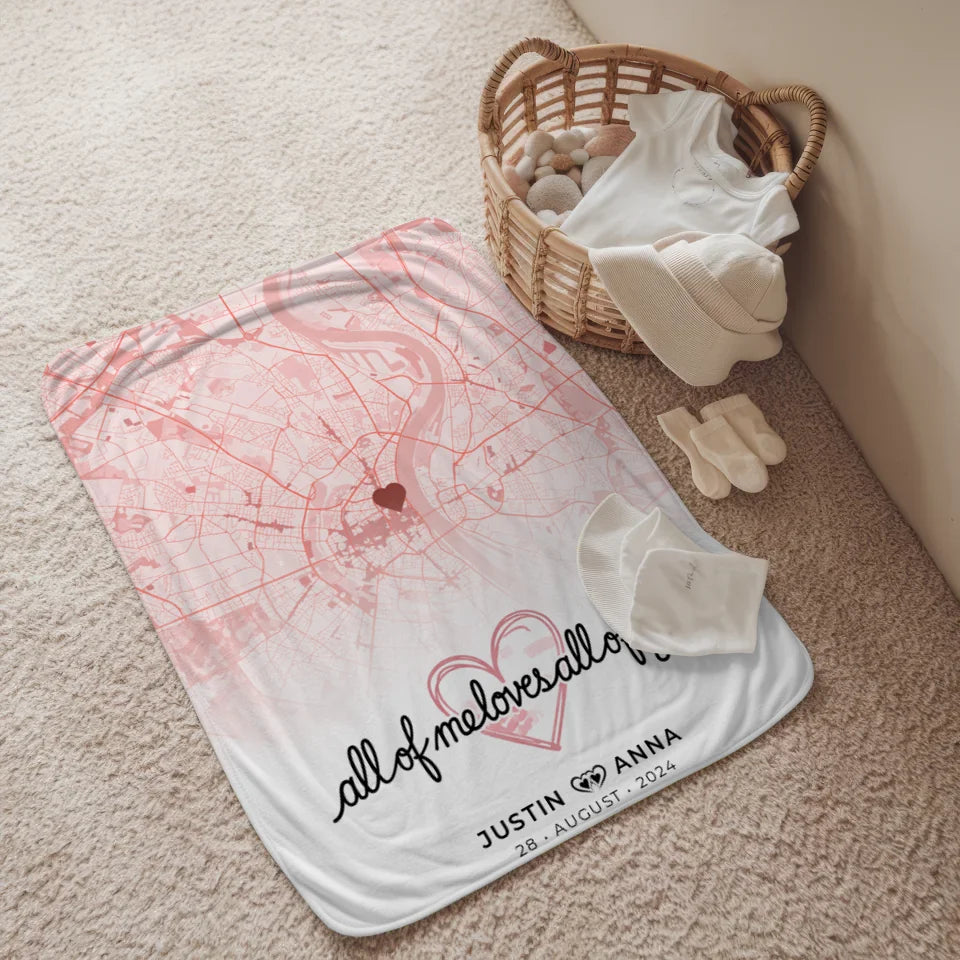 Überrasche deinen liebsten Menschen mit der einzigartigen personalisierten Roserot Stadtkarten Decke 'All Of Me Loves You'. Diese Decke ist nicht nur ein praktisches Accessoire, sondern auch ein Ausdruck eurer besonderen Beziehung. Mit dem romantischen Spruch 'Soulmates' wird jede Kuscheleinheit zu einem unvergesslichen Moment.