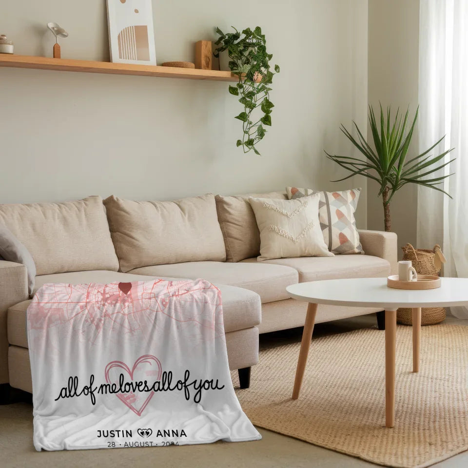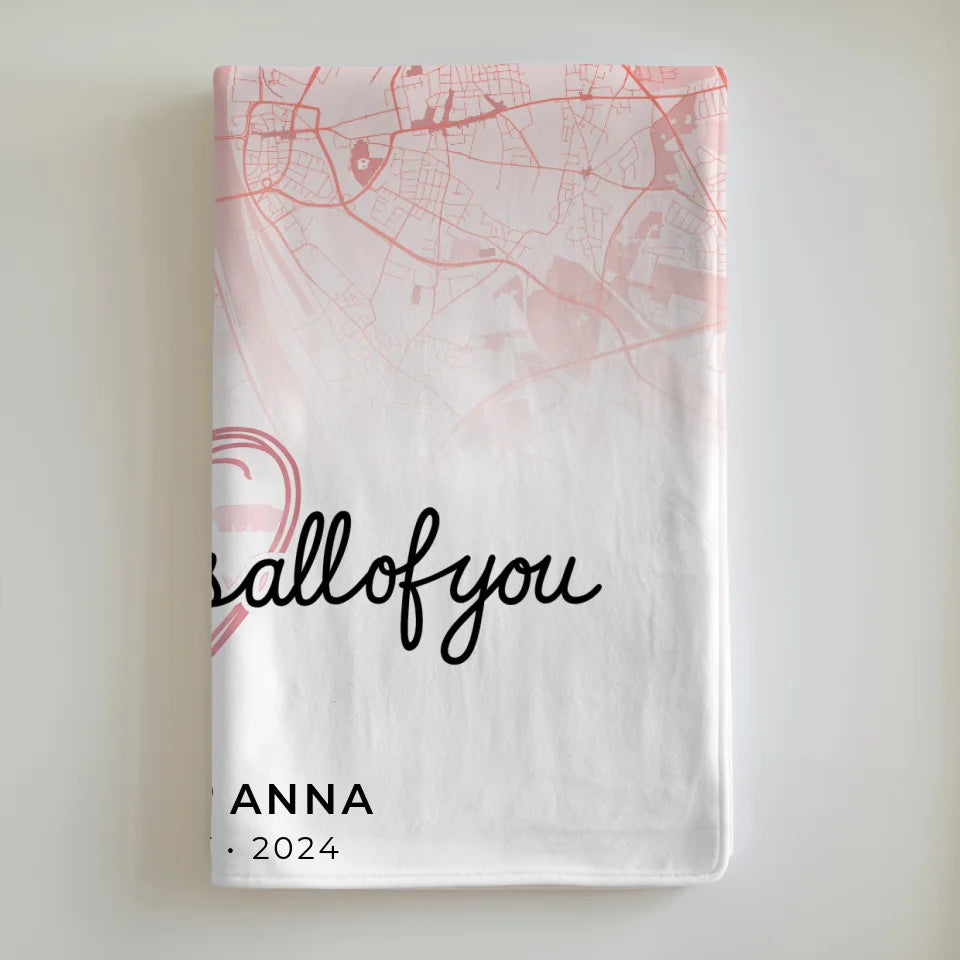 Greife jetzt zu und sichere dir die personalisierte Roserot Stadtkarten Decke 'All Of Me Loves You'. Mache jeden Anlass zu einem besonderen Erlebnis und halte die schönsten Momente eurer Beziehung immer im Blick!