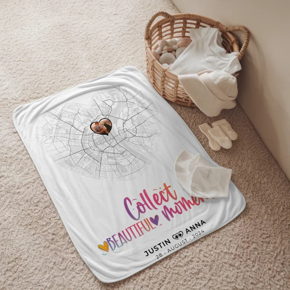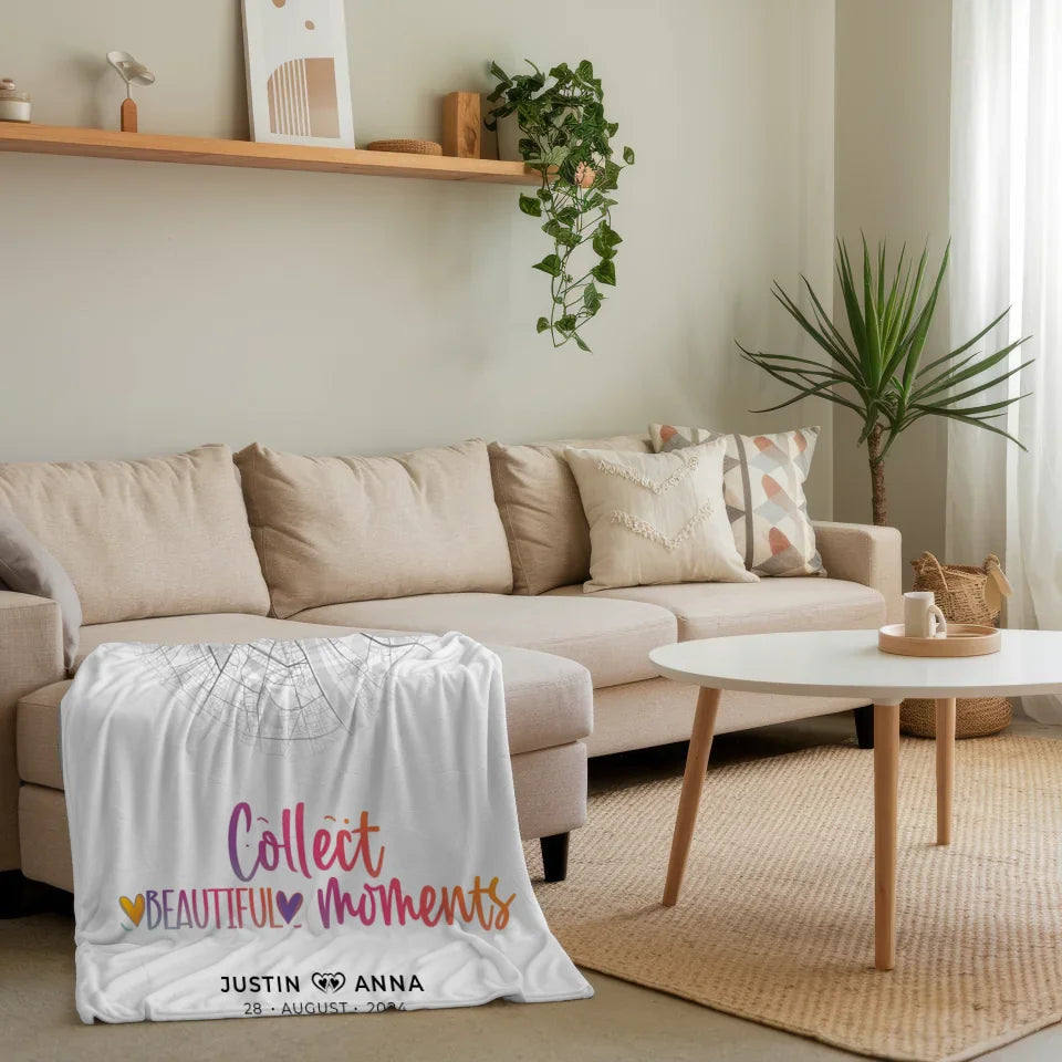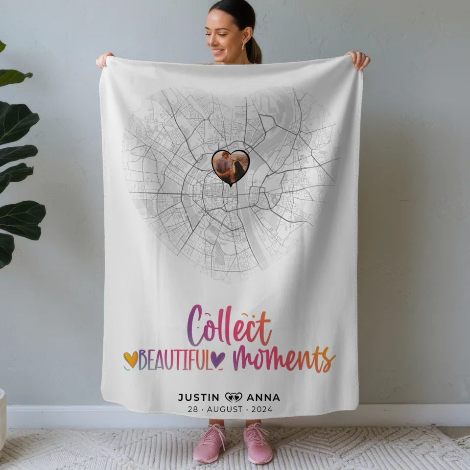 Die personalisierte Stadtkarten Decke für Paare ist das ideale Geschenk, um unvergessliche Erinnerungen kreativ festzuhalten. Mit dem herzlichen Spruch 'Collect Beautiful Moments' bringst du deine Liebe und gemeinsame Erlebnisse perfekt zur Geltung. Diese Decke ist nicht nur praktisch, sondern auch ein stilvolles Dekorationsstück, das jedem Raum Wärme verleiht.