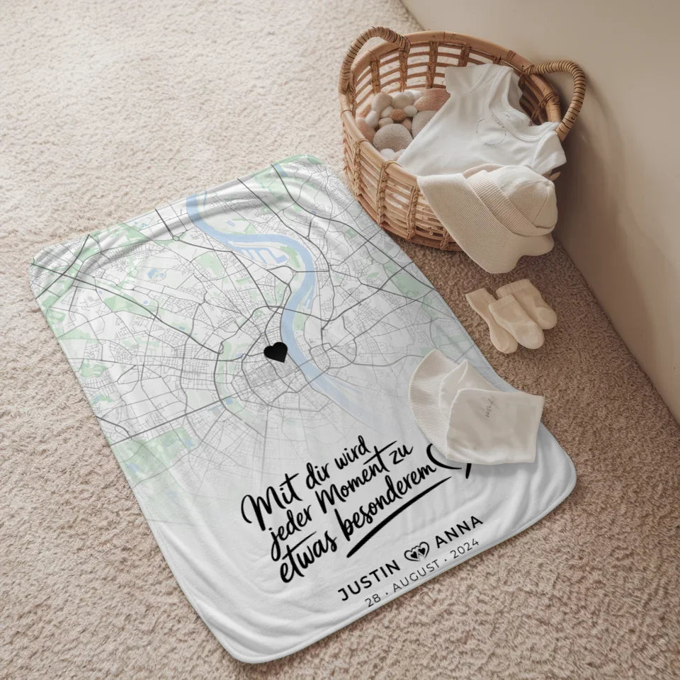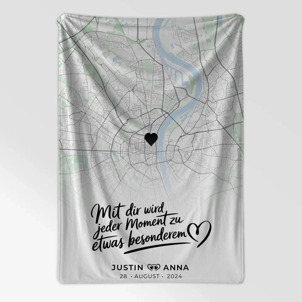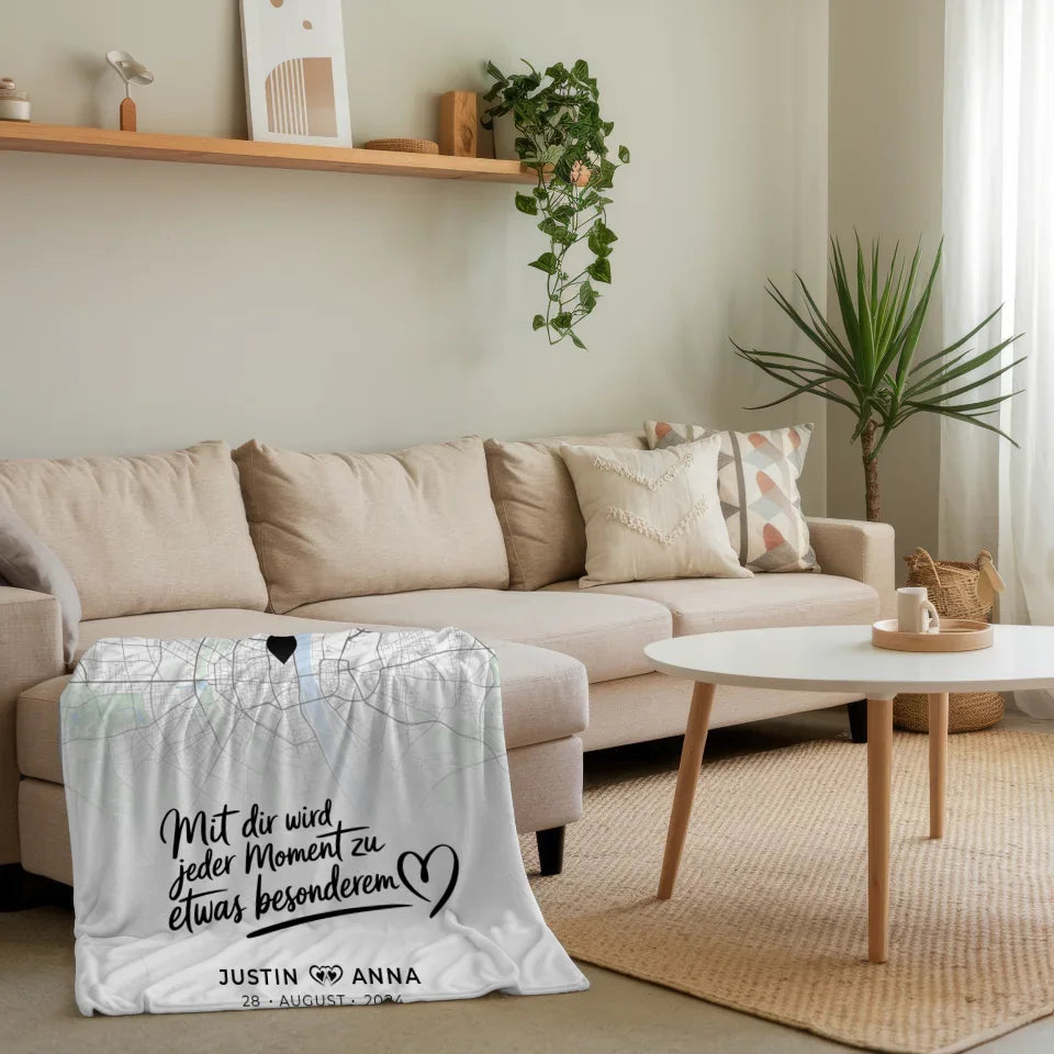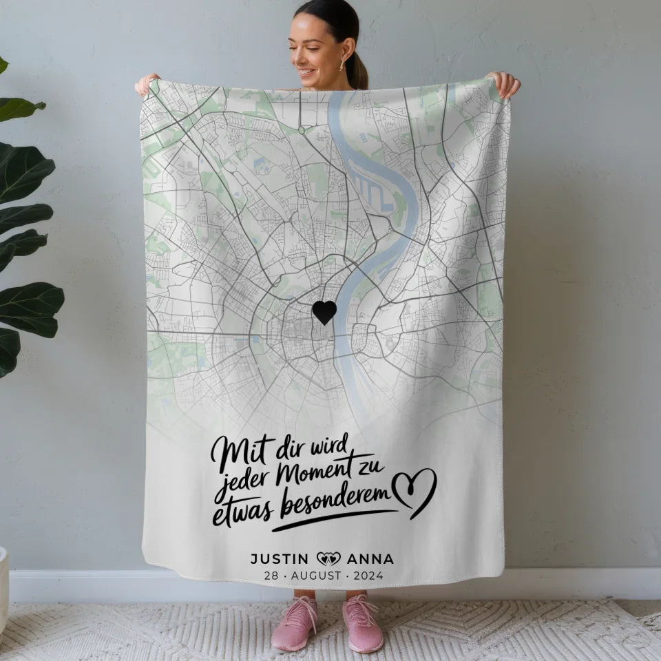 Bestelle jetzt die personalisierte Stadtkarten Decke für Paare mit dem Motto 'Mit Dir Wird Jeder Moment Zu Etwas Besonderem' und mache dich oder deine Liebsten glücklich!