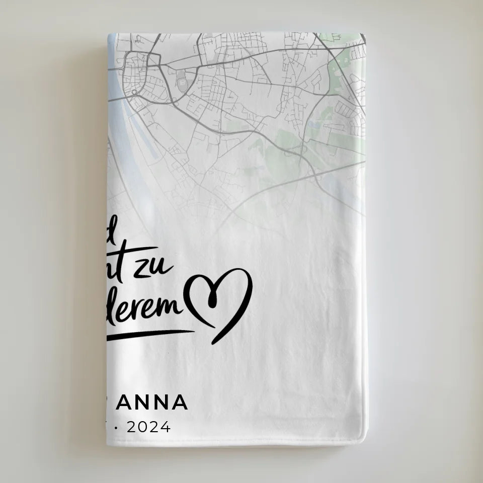 Die personalisierte Stadtkarten Decke lässt sich ganz nach deinen Wünschen gestalten. Wähle eine Karte mit einem besonderen Ort, der für euch eine Bedeutung hat, füge eure Namen hinzu und gestalte die Decke mit einem eigenen Spruch oder Wunschtext. So wird eure Decke zu einem einzigartigen Erinnerungsstück, das immer wieder Freude bringt.