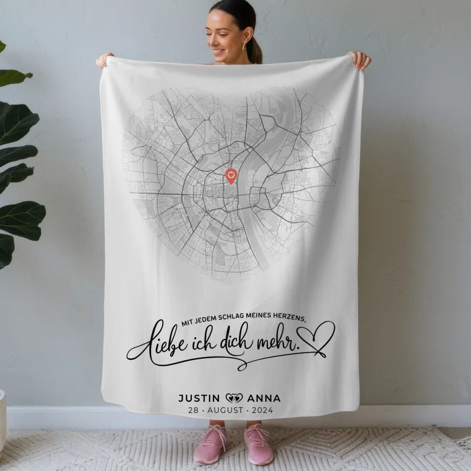 Entdecke die wunderschöne Personalisiert Stadtkarten Decke Paare Herz Wo Alles Begann, die nicht nur dekorativ ist, sondern auch eine ganz persönliche Geschichte erzählt. Mit dem zauberhaften Spruch 'With Each Beat Of My Heart I Love You More' wird diese Decke zu einem einzigartigen Geschenk für Deinen Lieblingsmenschen. Ob zum Valentinstag, zum Geburtstag oder zu Weihnachten – diese Decke ist die perfekte Wahl, um Deine Liebe auszudrücken.
