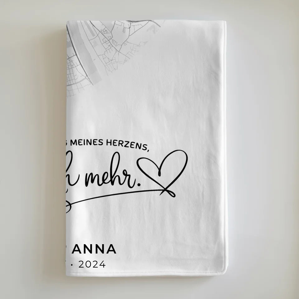 Gestalte Deine persönliche Stadtkarten Decke, indem Du einen besonderen Ort auswählst, der für Euch von Bedeutung ist. Ergänze die Decke mit Euren Namen und einem individuellen Spruch oder Wunschtext, um das Geschenk noch persönlicher zu machen. Diese einzigartige Kombination aus Design und Emotion macht die Decke zu einem unverwechselbaren Hingucker in Eurem Zuhause und erinnert Euch stets daran, wo alles begann.