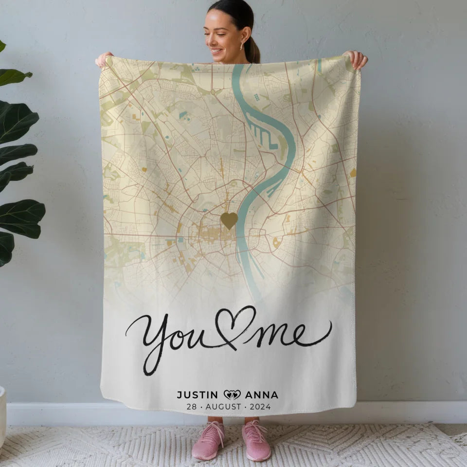 Bestelle jetzt die personalisierte Stadtkarten Decke Paare You & Me Vintage und halte eure Erinnerungen in einer einzigartigen Art und Weise fest. Diese Decke ist mehr als nur ein Geschenk – sie ist ein Zeichen der Liebe und der gemeinsamen Erlebnisse.