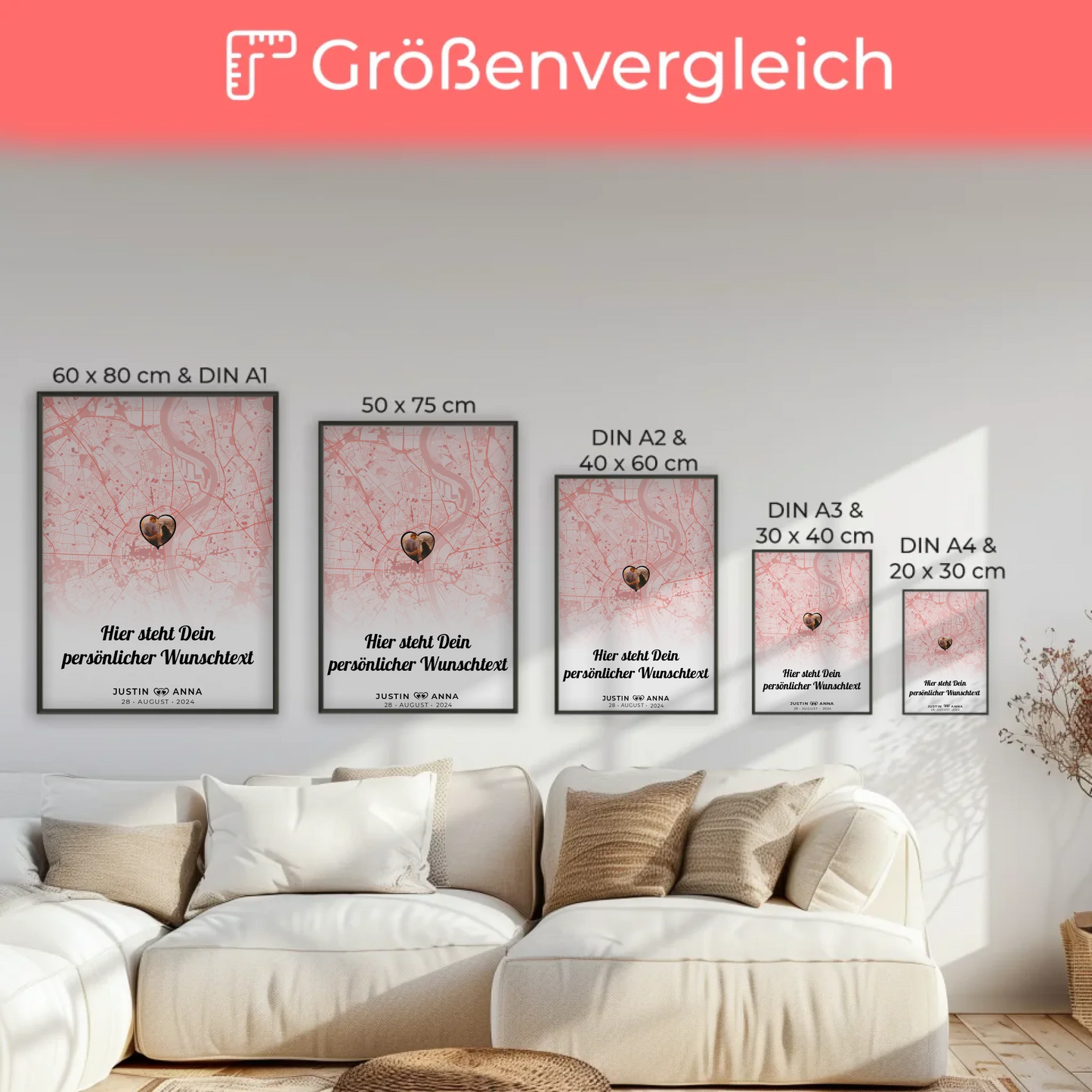 Unser personalisiertes Stadtkarten Poster ist das perfekte Geschenk für Paare, die ihre Liebe kreativ ausdrücken wollen. Gestalte noch heute Dein einzigartiges Kunstwerk und zeige Deinem Lieblingsmenschen, wie viel er oder sie Dir bedeutet!