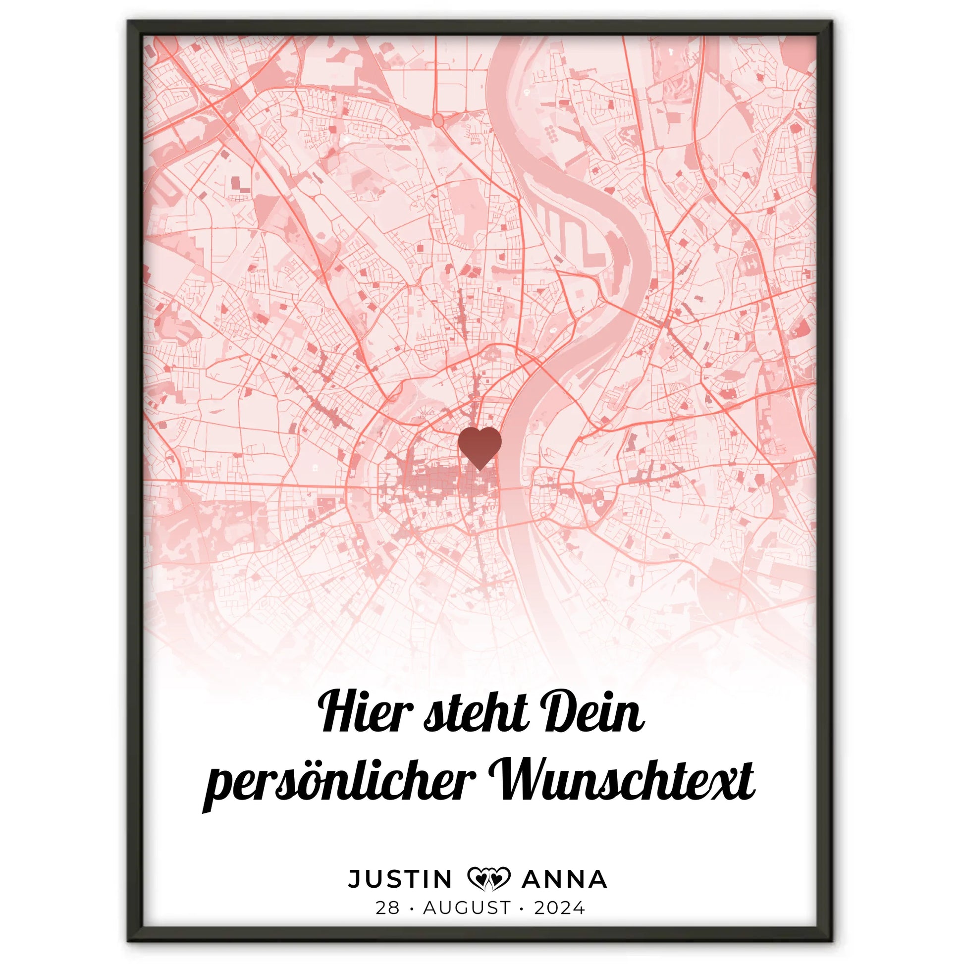 Du hast die Möglichkeit, das Poster mit einer Karte eines für euch bedeutenden Ortes zu gestalten. Ob der Ort eures ersten Treffens, eures ersten Kusses oder einfach der Platz, an dem alles begann – lass deine schönsten Erinnerungen lebendig werden! Füge dazu noch eure Namen und einen eigenen Spruch oder Wunschtext hinzu, um das Geschenk noch persönlicher zu machen. So wird jede Wand zum Ausdruck eurer einzigartigen Liebe.