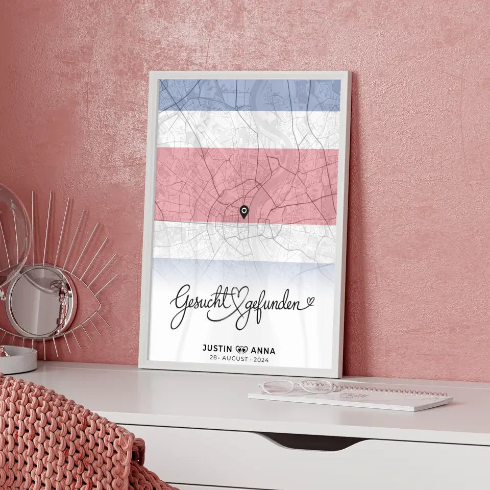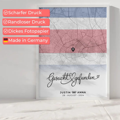 Lass deinen Liebsten spüren, wie besonders sie für dich sind. Bestelle jetzt dein personalisiertes Stadtkartenposter für Paare und halte die Magie eurer gemeinsamen Geschichte mit 'Gesucht & Gefunden' lebendig. Dieses besondere Poster wird mit einem Foto Map Marker hervorgehoben, um dem Ort eurer schönen Erinnerungen einen besonderen Platz zu geben.