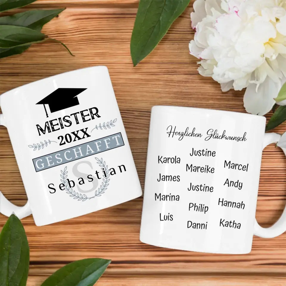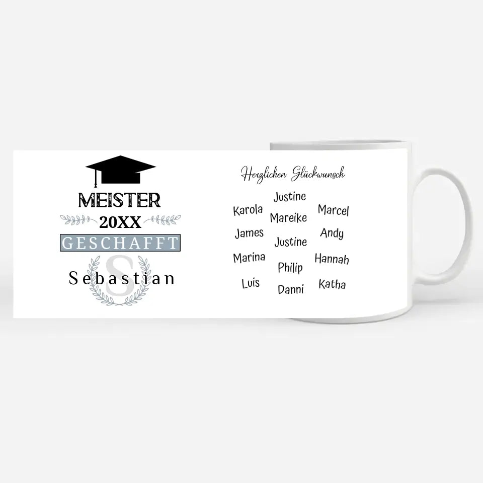 Personalisierte Abschluss Tasse Meister mit Name Blau Grau Abi