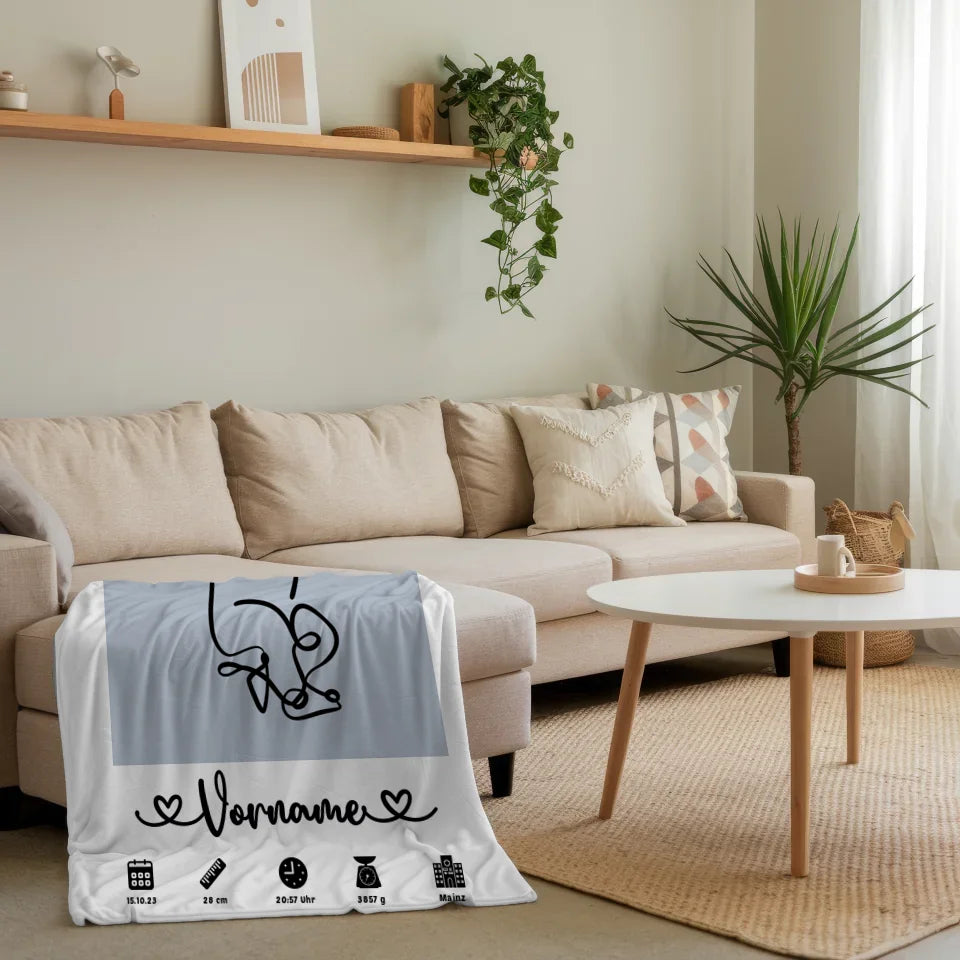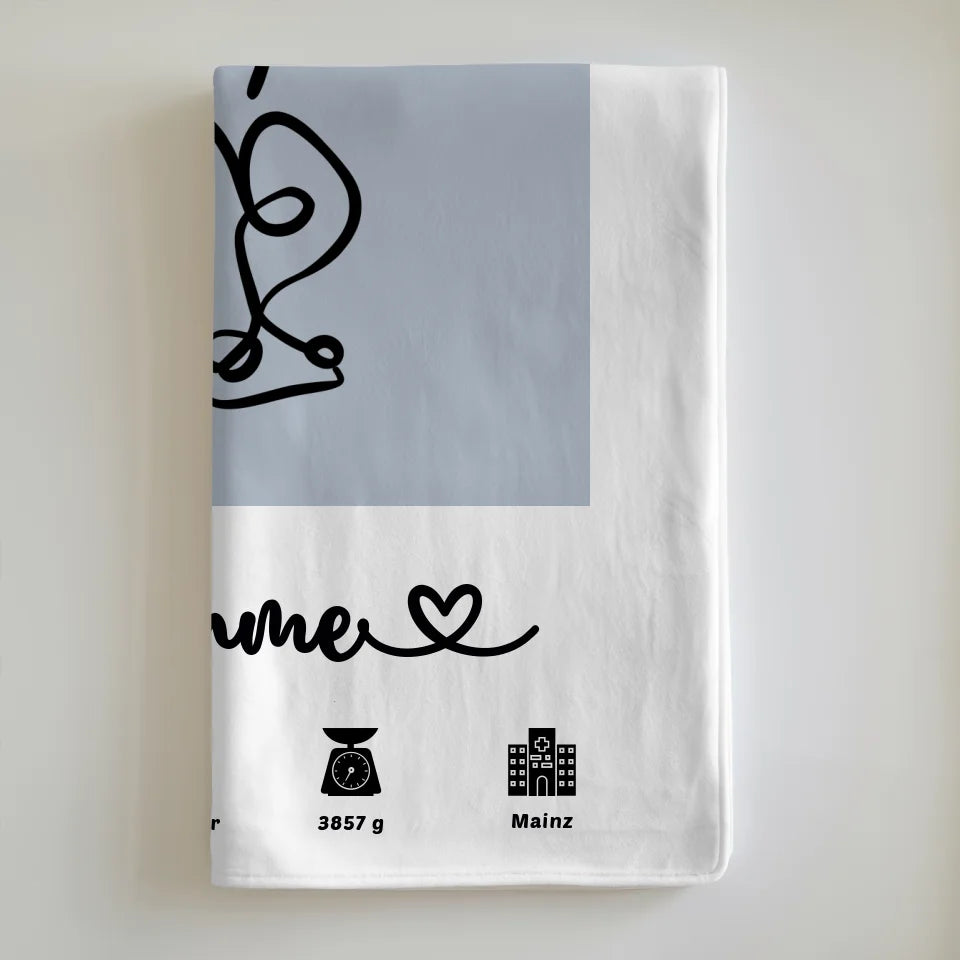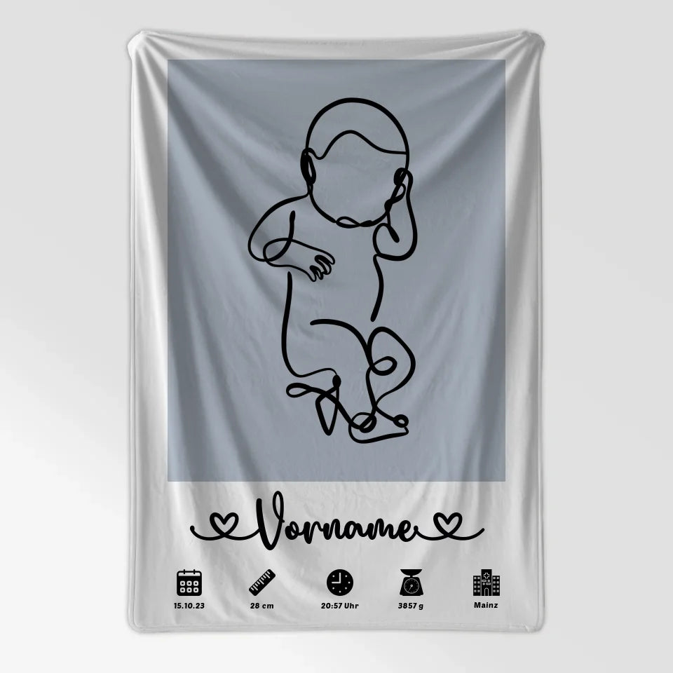 Personalisierte Decke Azurblau Geburt mit Name Geburtsdaten Baby Lineart