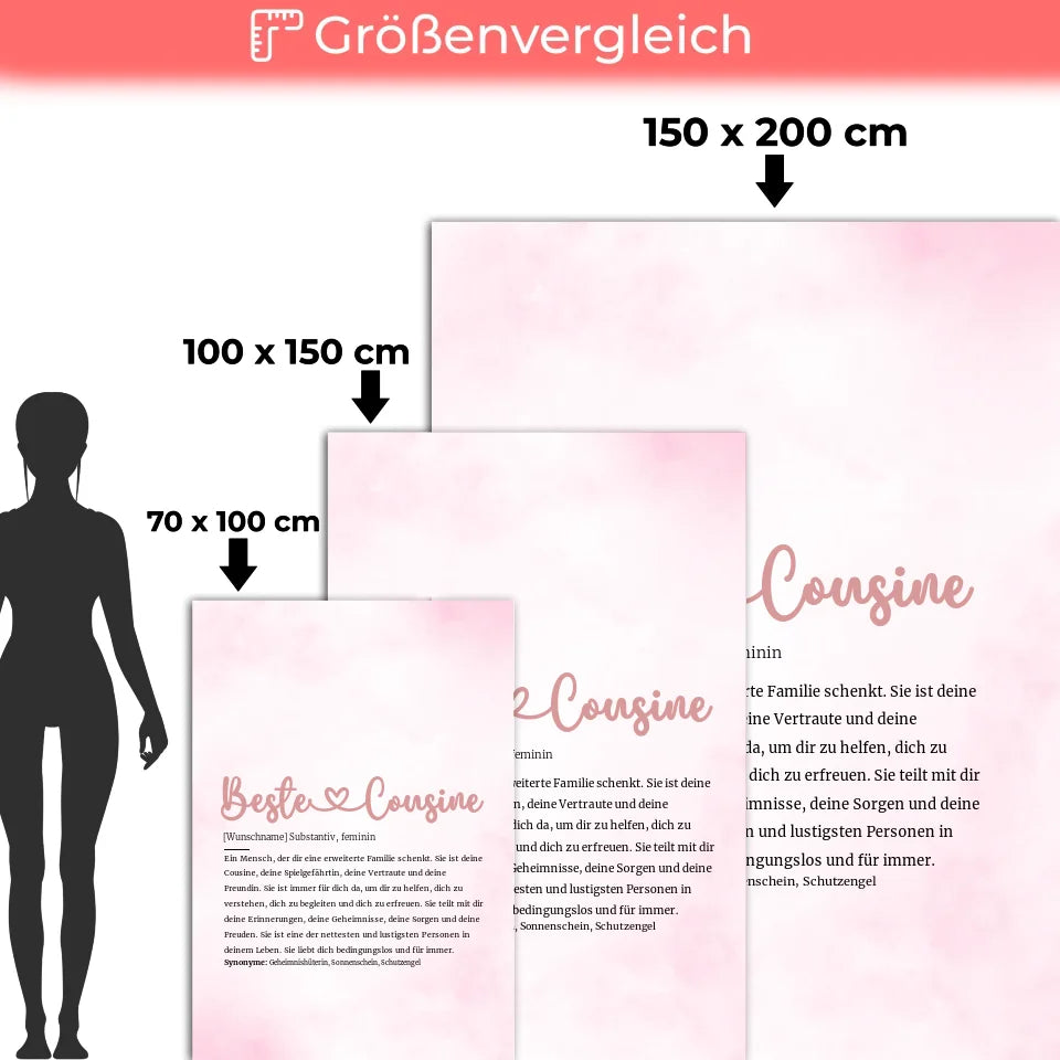 Mach deiner besten Cousine eine ganz besondere Freude mit unserer einzigartigen, personalisierten Decke Beste Cousine Herz mit Name Definition! Diese kuschelige Decke ist nicht nur ein praktisches Accessoire, sondern auch ein liebevolles Geschenk, das Herzen erwärmt. Du hast die Möglichkeit, den Namen deiner Cousine sowie ein Hintergrundbild zu personalisieren, um die Decke zu einem ganz individuellen Unikat zu machen. Ideal für Anlässe wie Geburtstage oder Weihnachten, wird dieses Geschenk sicherlich lange geschätzt und in Erinnerung bleiben. Die Kombination aus hochwertigem Material und liebevollem Design macht die Decke zu einem perfekten Symbol der Verbundenheit. Überrasche deine beste Cousine mit einer Decke, die ihre Bedeutung für dich in einer einzigartigen Definition festhält. Verschenke die Decke als Ausdruck deiner Wertschätzung und zeige, wie wichtig sie für dich ist! Perfekt für jede Gelegenheit, sorgt unsere personalisierte Decke für warme Momente voller Freude und Zuneigung.