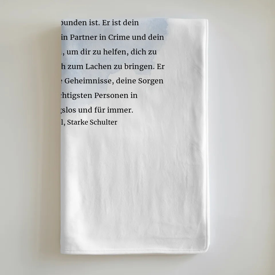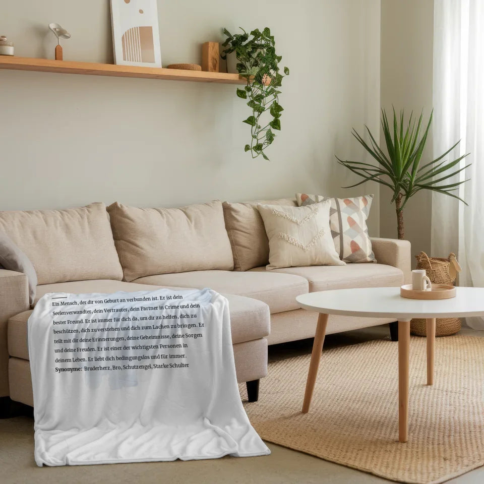 Mach deinem Bruder eine ganz besondere Freude mit unserer personalisierten Decke Bruder Definition mit Name Pinsel Klecks Blau. Diese einzigartige Decke ist nicht nur warm und kuschelig, sondern auch ein perfektes Geschenk für verschiedene Anlässe, wie zum Geburtstag oder zu Weihnachten. Du kannst die Decke ganz nach deinen Wünschen gestalten und mit dem Namen deines Bruders versehen. Die kreative Gestaltung mit Pinsel Klecks Blau verleiht der Decke zudem einen modernen und fröhlichen Look. Ob für gemütliche Abende auf der Couch oder als stylishes Dekorationselement im Schlafzimmer, diese personalisierte Decke ist ein echter Hingucker. Zeige deinem Bruder, wie sehr du ihn schätzt, und mache ihm ein Geschenk, das Herz und Heim wärmt. Ob als Geburtstagsgeschenk oder weihnachtliche Überraschung, die personalisierte Decke ist immer eine gute Wahl. Bestelle jetzt deine Decke und mach jeden Tag zu einem besonderen Erlebnis!