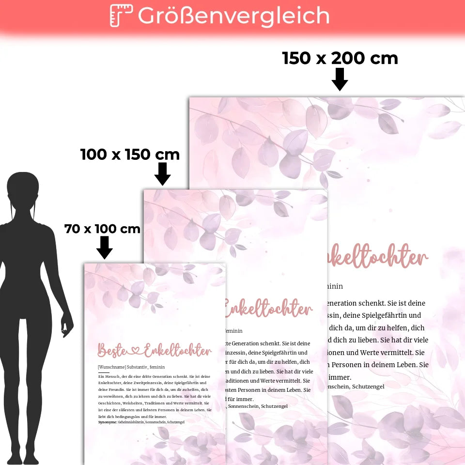 Zeige deiner Enkeltochter, wie besonders sie für dich ist, mit unserer personalisierten Decke Definition Beste Enkeltochter Herz mit Name! Diese einzigartige Decke ist nicht nur ein praktisches Accessoire, sondern auch eine liebevolle Erinnerung, die das Herz deiner Enkeltochter berühren wird. Du kannst die Decke individuell gestalten, indem du ihren Namen und ein passendes Hintergrundbild auswählst. Egal ob zum Geburtstag oder zu Weihnachten, dieses personalisierte Geschenk ist die perfekte Wahl, um deine Liebe und Wertschätzung auszudrücken. Die hochwertige Decke sorgt für Wärme und Gemütlichkeit und wird sicherlich ein Highlight in ihrem Zimmer sein. Lass deiner Kreativität freien Lauf und kreiere eine Decke, die so einzigartig ist wie die beste Enkeltochter der Welt! Bestelle jetzt deine personalisierte Decke und mache ihr eine Freude, die sie nie vergessen wird!
