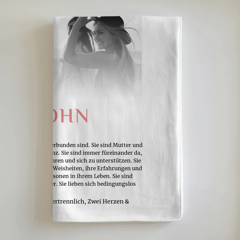 Die personalisierte Decke 'Definition Mama & Sohn 5 Fotos Black & White' ist das ideale Geschenk für jeden Anlass, sei es zum Geburtstag oder zu Weihnachten. Du hast die Möglichkeit, 5 Fotos sowie einen Namen individuell zu gestalten, um so ein ganz persönliches und einzigartiges Geschenk zu kreieren. Diese Decke ist nicht nur praktisch, sondern auch ein emotionales Highlight, das Erinnerungen festhält und warme Momente schafft.
