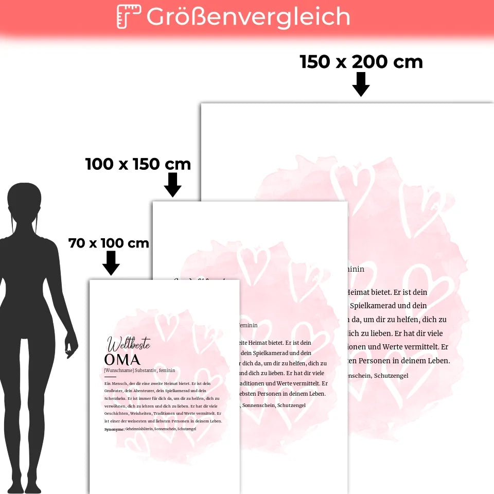 Suchst du das perfekte Geschenk für deine Oma? Mit der personalisierten Decke Definition Oma mit Name Herzchen Rosa schaffst du ein Unikat, das von Herzen kommt. Diese kuschelige Decke ist nicht nur praktisch, sondern auch ein liebevolles Geschenk, das deine Oma immer an dich erinnern wird. Du kannst die Decke mit dem Namen deiner Oma personalisieren und so ein ganz besonderes Geschenk kreieren. Egal ob zum Geburtstag, zu Weihnachten, zu Ostern oder zum Muttertag – diese Decke ist die ideale Überraschung für jeden Anlass.