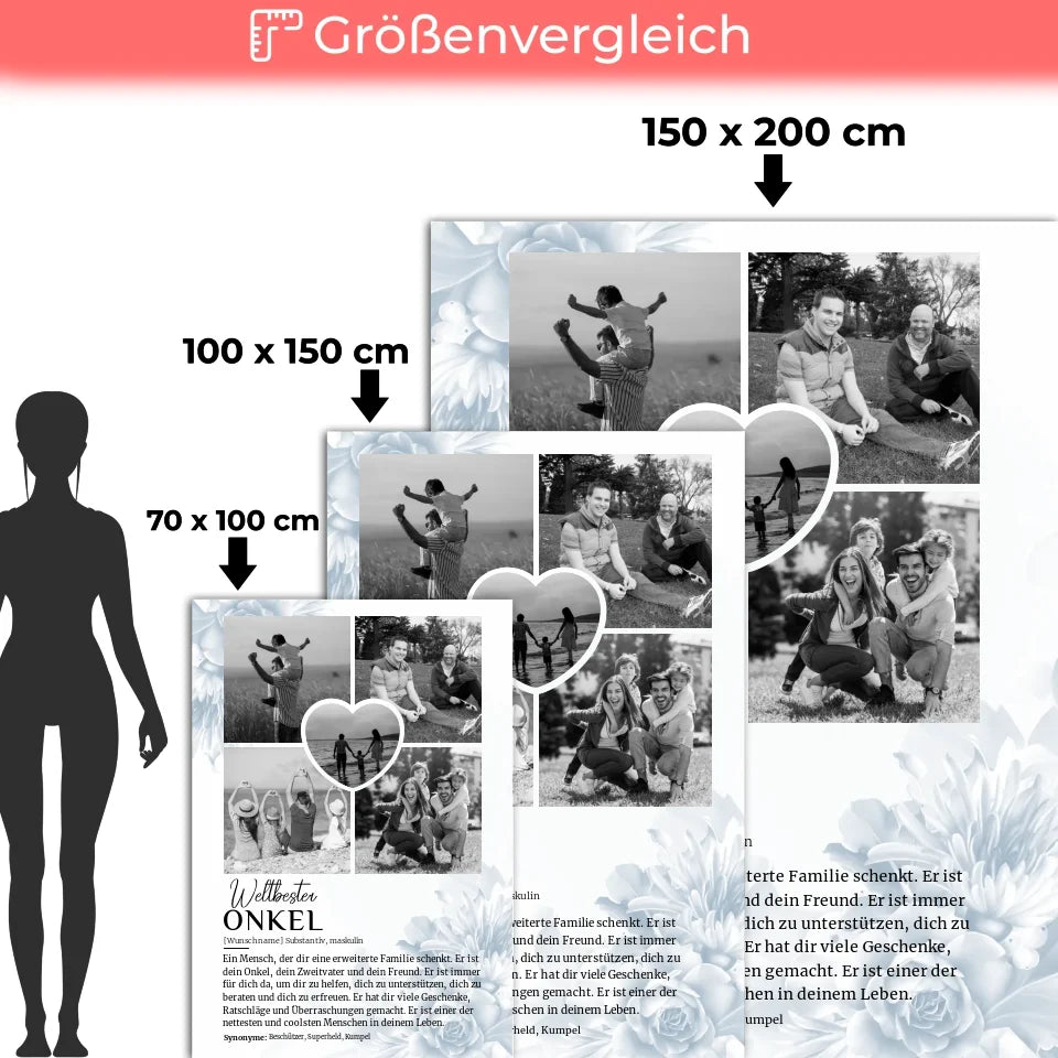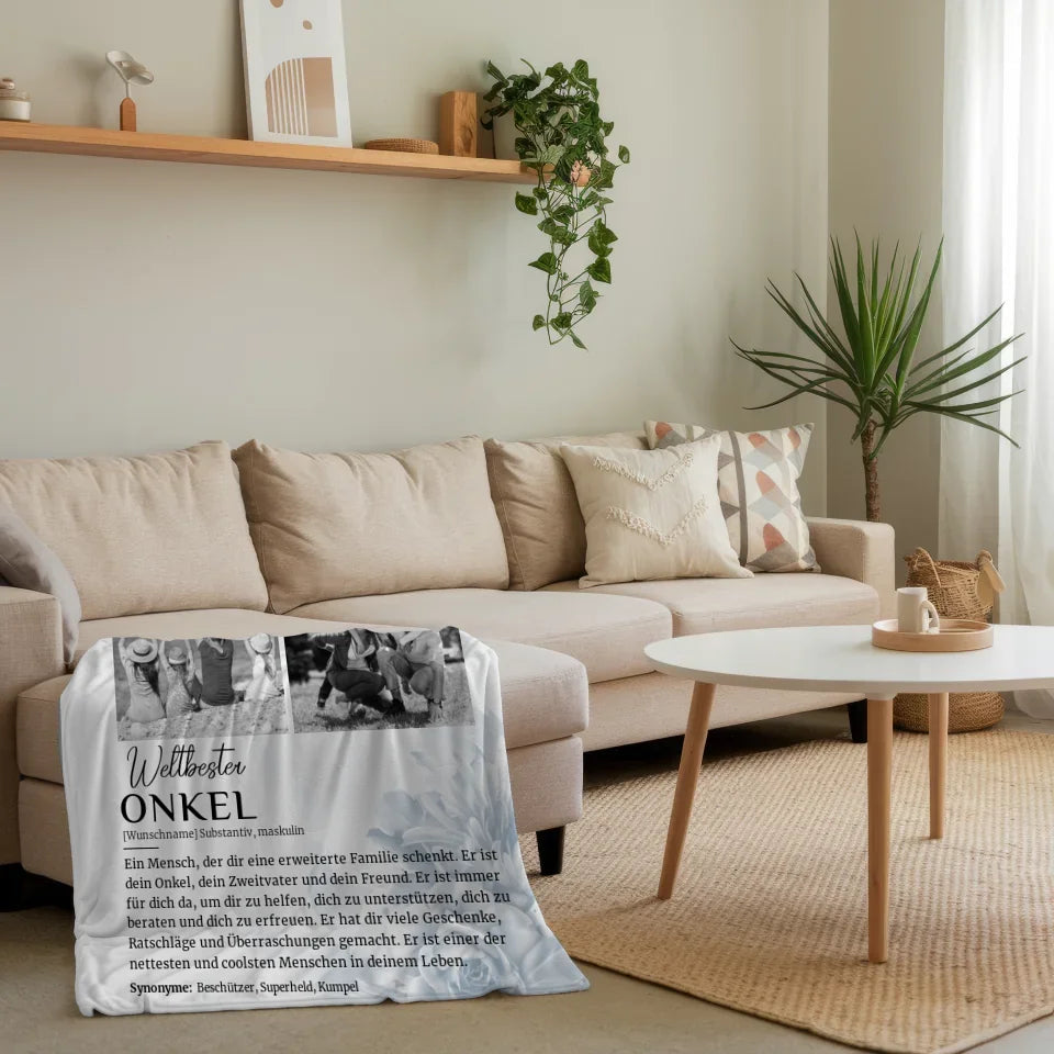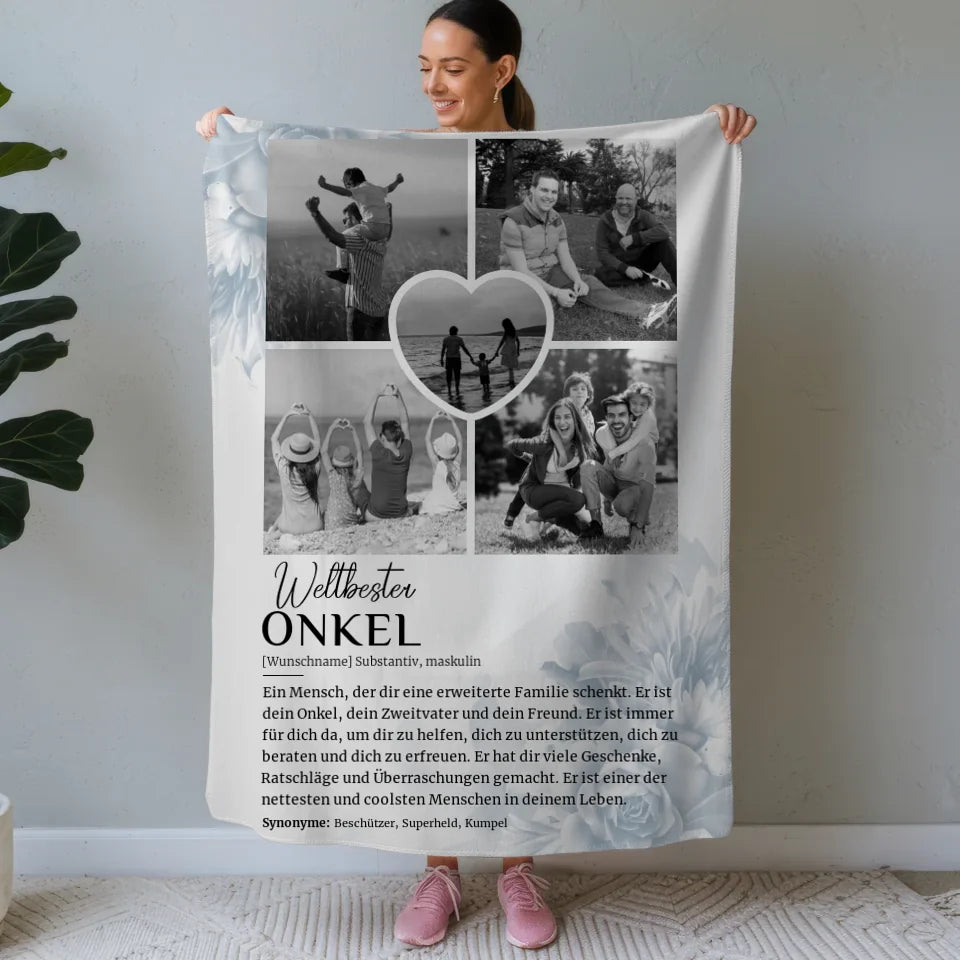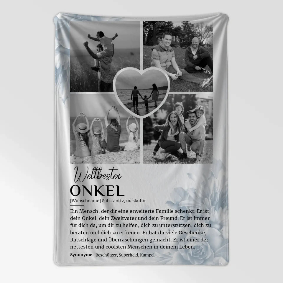 Mach deinen Onkel glücklich mit einem persönlichen Geschenk, das seine Persönlichkeit widerspiegelt. Hol dir jetzt deine personalisierte Decke Definition Onkel 5 Fotos Black & White und lasse deine Ideen wahr werden!