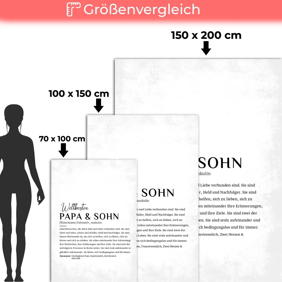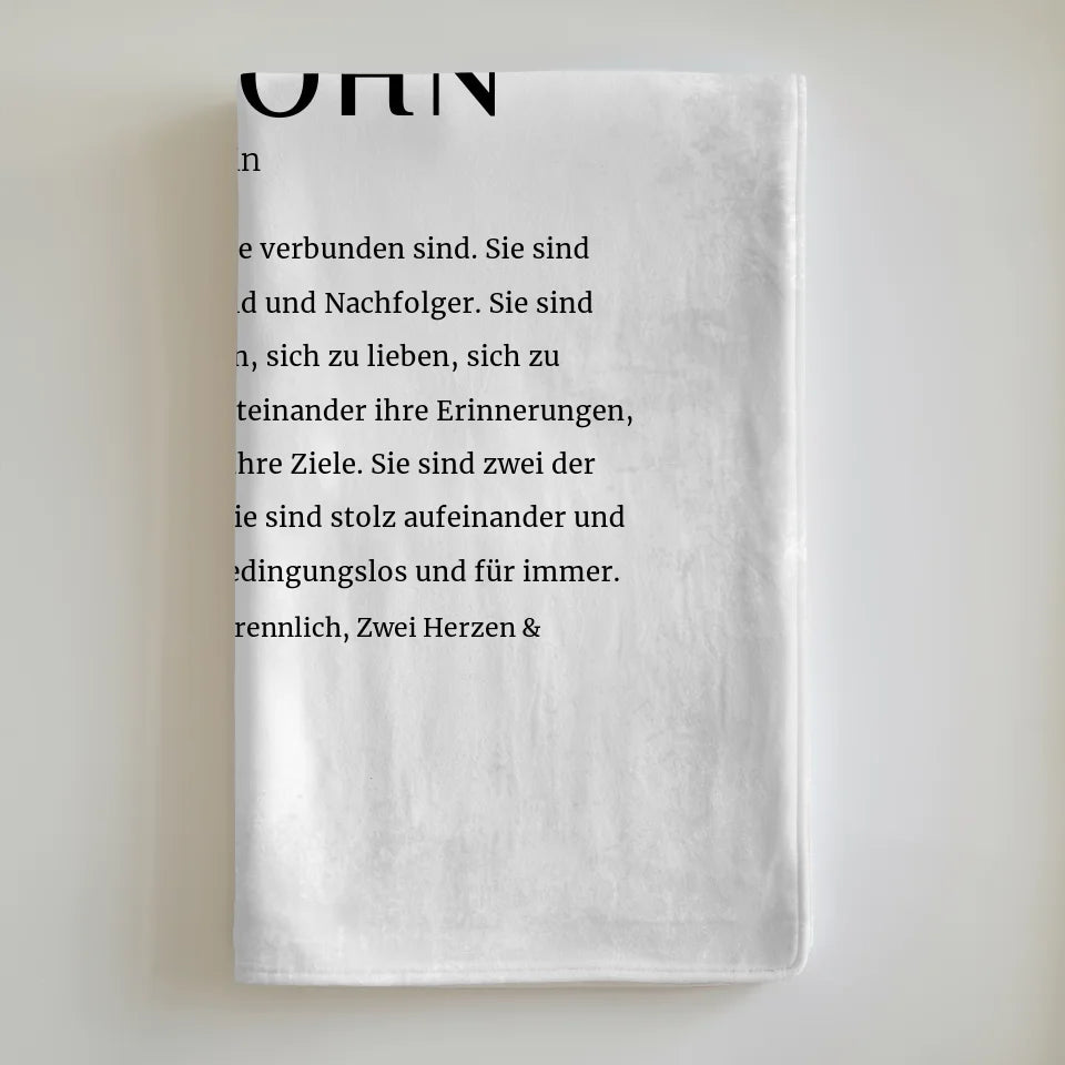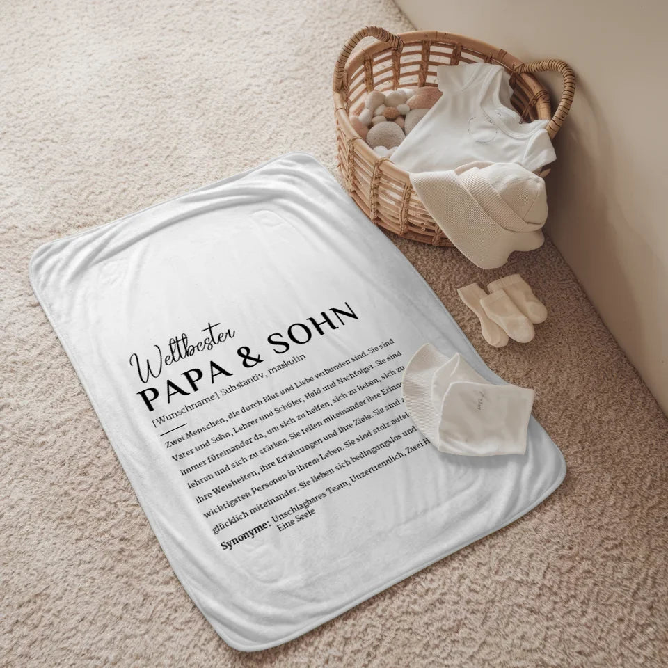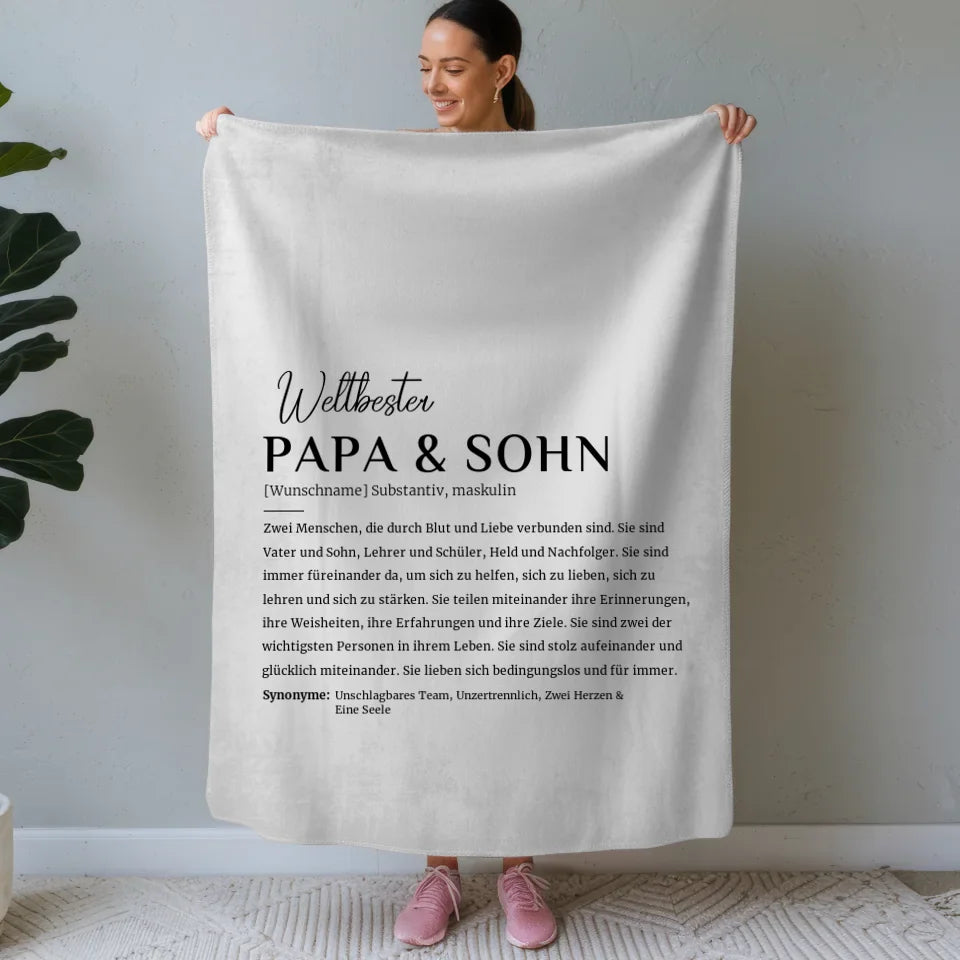 Suchst du ein einzigartiges und personalisiertes Geschenk für den besten Papa der Welt? Die personalisierte Decke Definition Papa & Sohn Grau Vintage mit Name ist die perfekte Wahl! Mit dieser hochwertigen Decke schaffst du nicht nur ein kuscheliges Zuhause, sondern machst deinem Vater auch ein ganz besonderes Geschenk, das ihn immer an eure Verbundenheit erinnert.