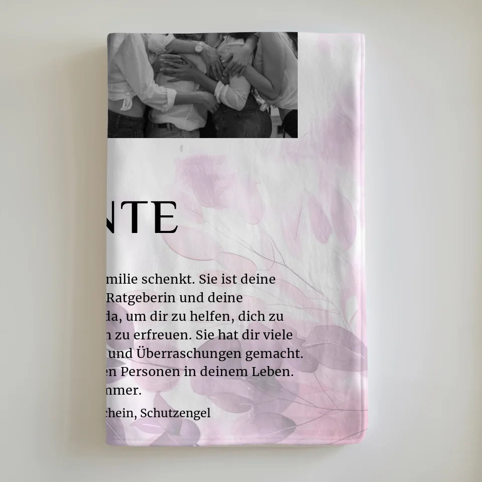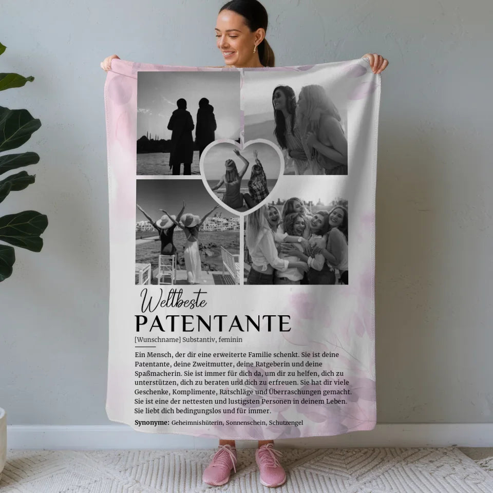 Entdecke die perfekte Möglichkeit, deiner Patentante eine ganz besondere Freude zu machen mit unserer personalisierten Decke Definition Patentante 5 Fotos Schwarz Weiß. Diese hochwertige Decke ist nicht nur ein praktisches Accessoire, sondern auch ein emotionales Geschenk, das deine Wertschätzung zeigt. Gestalte die Decke ganz individuell mit 5 deiner liebsten Fotos, dem Namen deiner Patentante und einem schönen Hintergrundbild in Pink Rosa Floral. Egal ob zum Geburtstag oder zu Weihnachten, dieses personalisierte Geschenk wird garantiert für Freude sorgen.