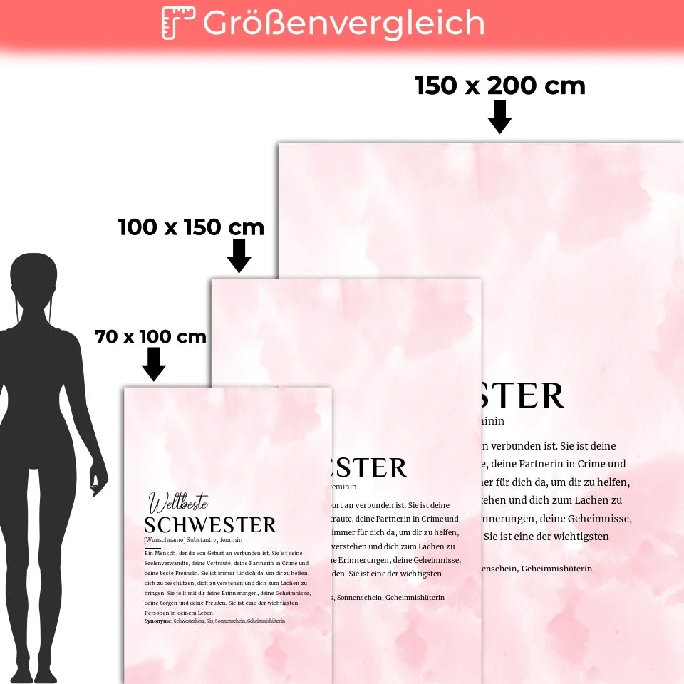 Suchst du nach einem einzigartigen Geschenk für deine Schwester? Dann ist die personalisierte Decke Definition Schwester Rosa Aquarell mit Name genau das Richtige für dich! Diese zauberhafte Decke vereint Stil und persönliche Note und sorgt dafür, dass deine Schwester sich rundum wohlfühlt.