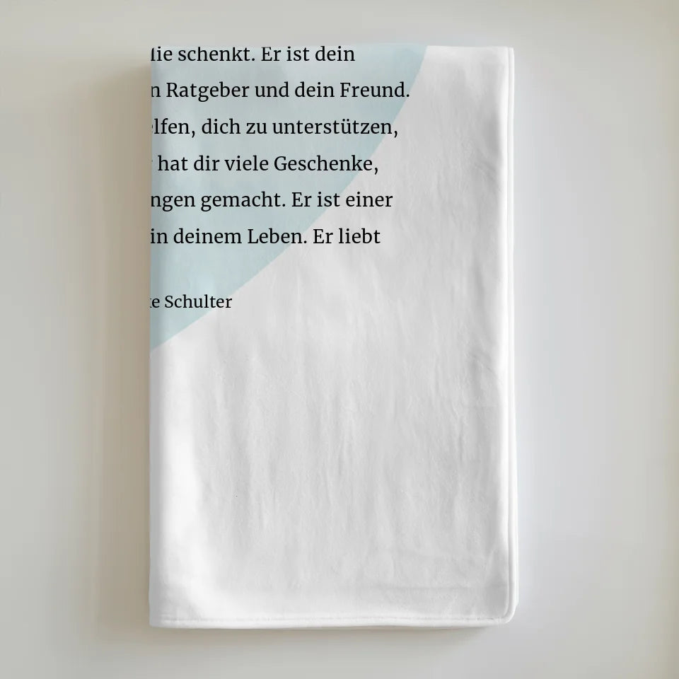 Entdecke die einzigartige personalisierte Decke Definition Schwiegervater mit Name Wasserfarben Herz – das perfekte Geschenk, um Deinem Schwiegervater eine ganz besondere Freude zu machen! Diese Decke ist nicht nur ein praktischer Begleiter an kalten Abenden, sondern auch ein liebevolles Präsent, das persönliche Wertschätzung ausdrückt. Du kannst den Namen Deines Schwiegervaters auf die Decke drucken lassen und somit ein ganz individuelles Geschenk kreieren. Optimal geeignet ist die Decke für Anlässe wie Geburtstage oder Weihnachten. Mach seinem Tag noch schöner mit einem Geschenk, das von Herzen kommt. Die stilvollen Wasserfarben in Hellblau verleihen der Decke eine besondere Note und machen sie zu einem echten Hingucker in jedem Wohnraum. Eine personalisierte Decke ist mehr als nur ein praktisches Accessoire – sie ist ein Symbol der Verbundenheit. Schenke Deinem Schwiegervater diese bezaubernde Decke und lasse ihn wissen, wie wertvoll er für Dich ist!