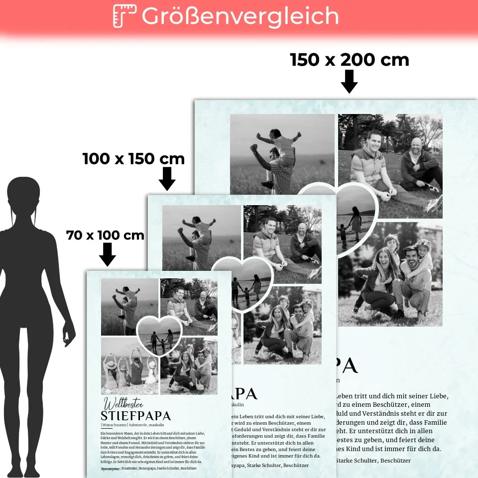 Egal ob zum Geburtstag oder einem anderen besonderen Anlass, die personalisierte Decke Definition Stiefpapa wird mit Sicherheit für Überraschung und Freude sorgen! Überrasche deinen Stiefpapa mit einem Geschenk, das seine Bedeutung in deinem Leben widerspiegelt. Die Kombination aus 5 Fotos, einer persönlichen Note mit Name und dem stylishen Design macht diese Decke zu etwas ganz Besonderem.