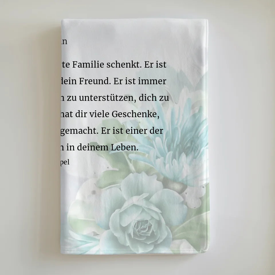 Die Decke ist nicht nur ein optisches Highlight, sondern auch wunderbar weich und bequem. Hülle deinen Onkel in diese tolle Decke und zeige ihm, wie viel er dir bedeutet. Jedes Mal, wenn er die Decke nutzt, wird er an eure gemeinsamen Momente erinnert. Diese personalisierte Decke ist ideal, um eine gemütliche Atmosphäre zu schaffen und gleichzeitig eine persönliche Botschaft zu übermitteln. Verschenke die Decke Floral Blau und mache deinem Onkel eine Freude, die er nie vergessen wird.