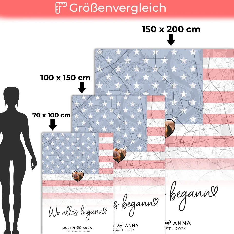 Entdecke die einzigartige personalisierte Decke Foto Stadtkarte Paare USA Wo Alles Begann – das perfekte Geschenk für besondere Anlässe! Ob zum Valentinstag, Geburtstag oder Weihnachten, diese Decke wird Deine Liebsten begeistern. Du kannst sie ganz nach Deinen Wünschen gestalten: lade einfach ein Foto hoch, wähle eine Stadtkarte mit einem besonderen Ort und füge die Namen sowie Deinen eigenen Spruch oder Wunschtext hinzu. So hältst Du Erinnerungen lebendig und schaffst ein einzigartiges Stück, das immer an die gemeinsamen Momente erinnert.