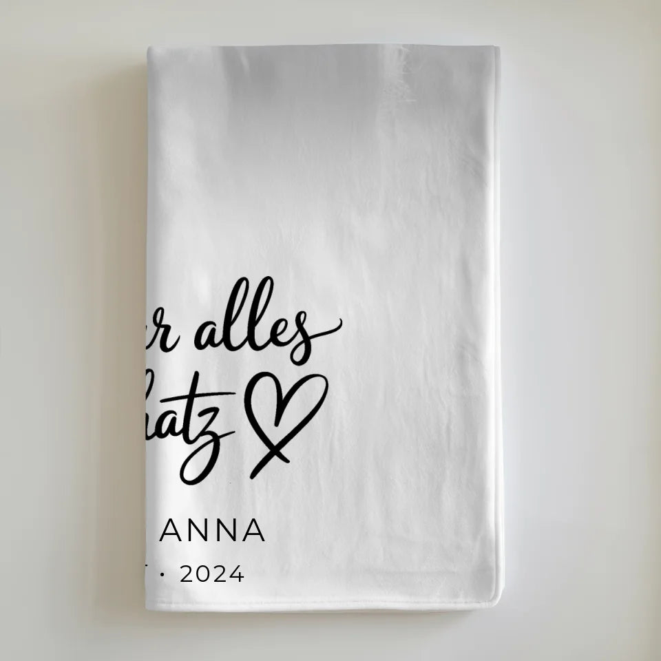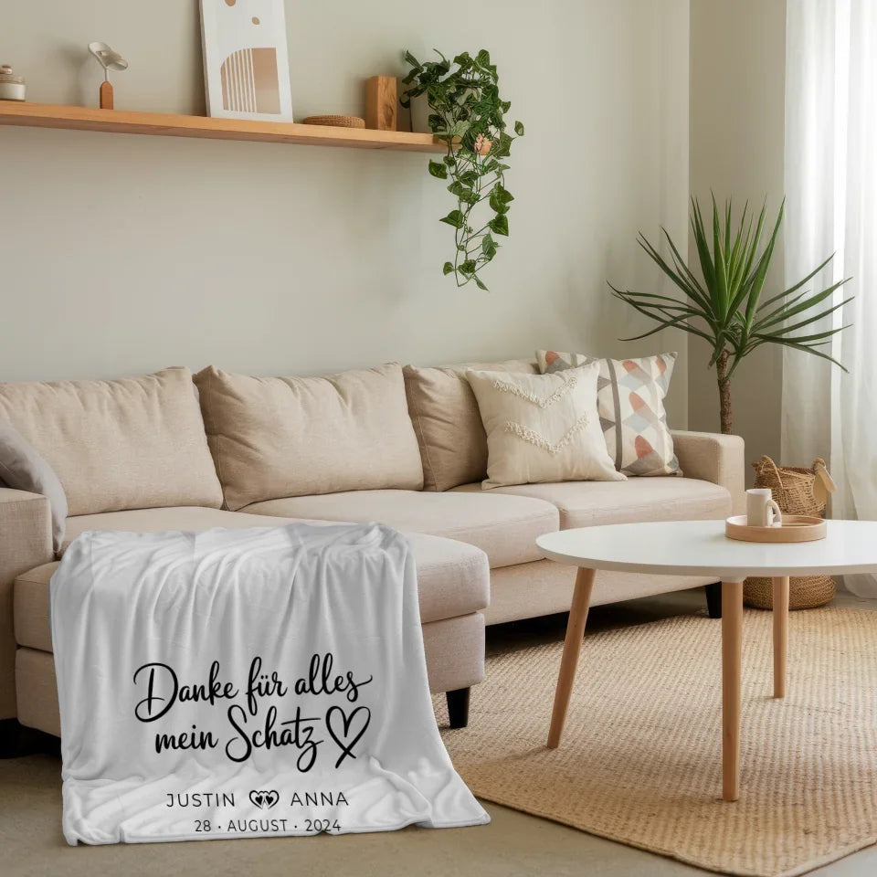 Diese Decke ist nicht nur kuschelig und bequem, sondern eignet sich auch hervorragend als Geschenk zu vielen Anlässen. Ob zum Valentinstag, zum Geburtstag oder auch zu Weihnachten – mit dieser personalisierten Decke liegst du immer richtig. Überrasche deinen Schatz mit einem Geschenk, das sagt: 'Danke Für Alles Mein Schatz' und zeige, wie viel dir eure gemeinsamen Erinnerungen bedeuten.