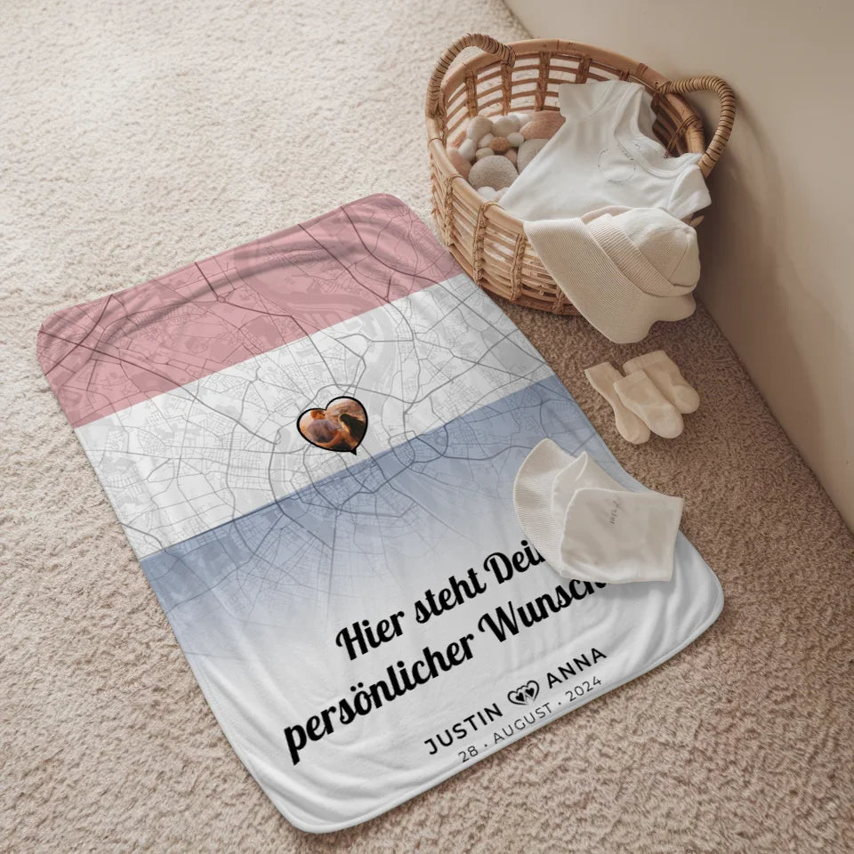Entdecke die perfekte Möglichkeit, deine Liebe zu feiern mit unserer einzigartigen personalisierten Decke für Paare mit Stadtkarte und Foto Niederlande. Diese kuschelige Decke ist nicht nur ein praktisches Accessoire, sondern auch ein wunderschönes Geschenk, das eure gemeinsamen Erinnerungen widerspiegelt. Personalisiere sie mit einem speziellen Foto von euch, einer Stadtkarte des Ortes, wo alles begann, euren Namen, einem eigenen Wunschtext oder Spruch und sogar der Länderflagge der Niederlande.