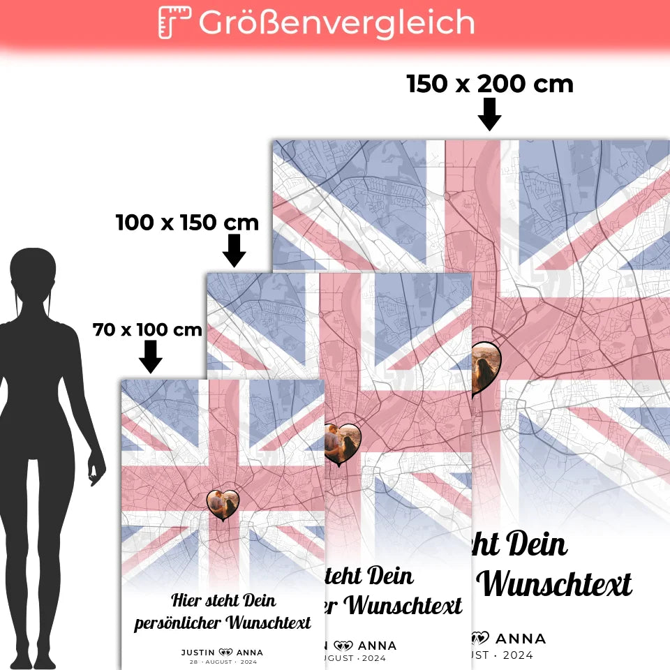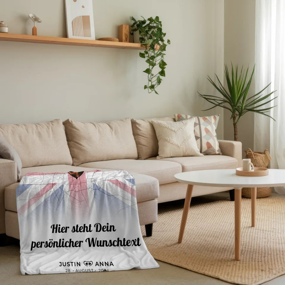 Gönn dir und deinem Partner oder einem befreundeten Paar diese wunderbare personalisierte Decke! Erlebe, wie aus einer einfachen Decke ein einzigartiges Kunstwerk entsteht, das Erinnerungen weckt und für Gemütlichkeit sorgt. Mache diesen besonderen Moment mit der personalisierten Decke für Paare Stadtkarte Foto England Wunschtext unvergesslich!