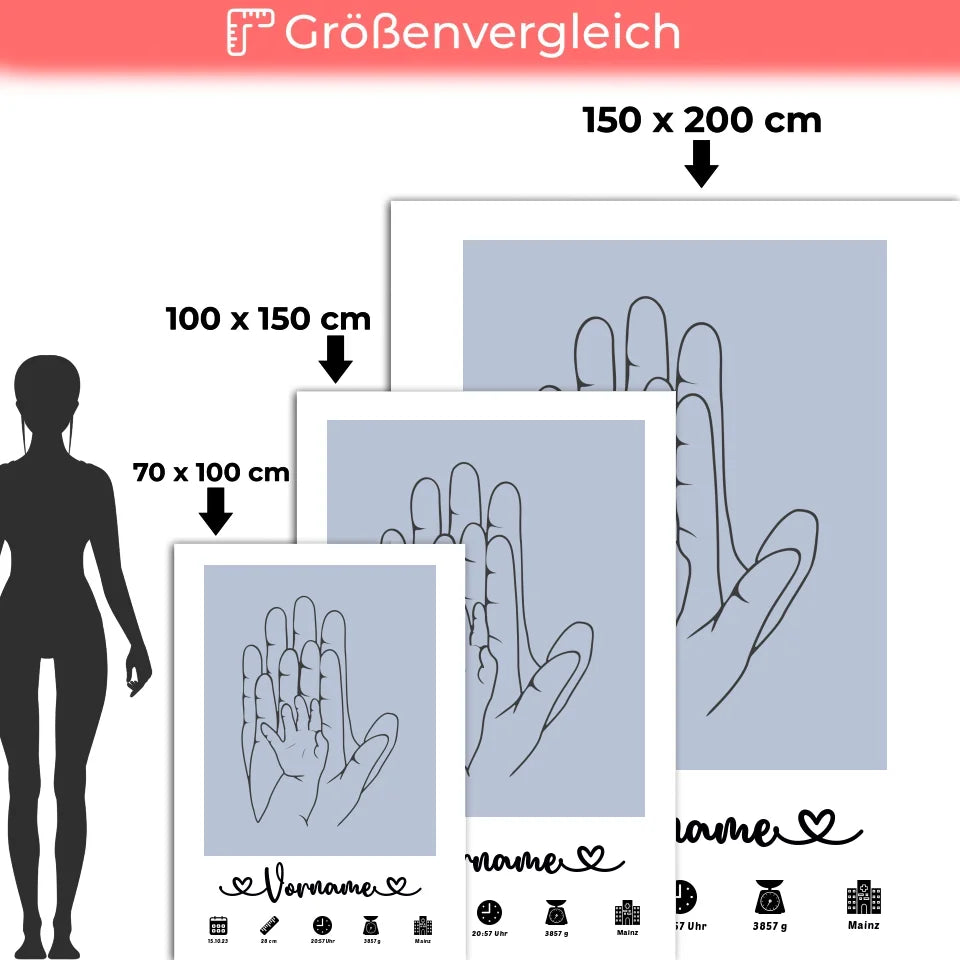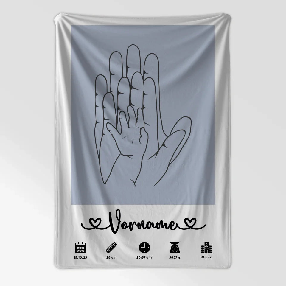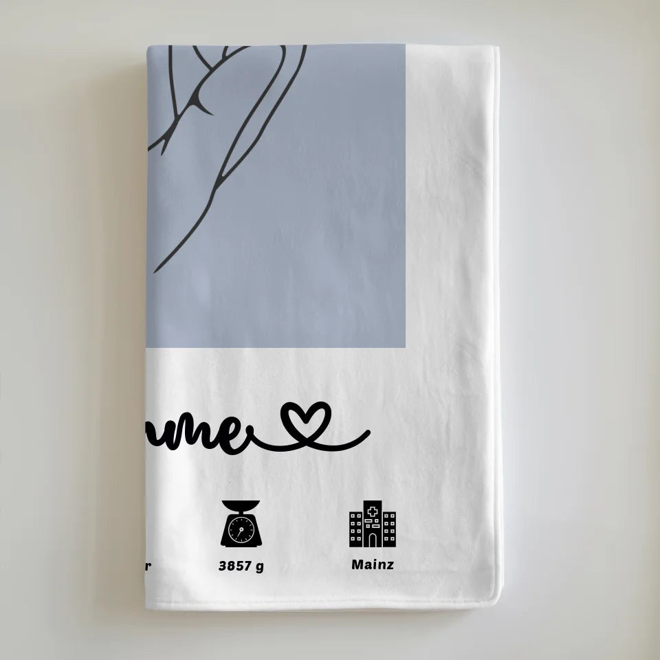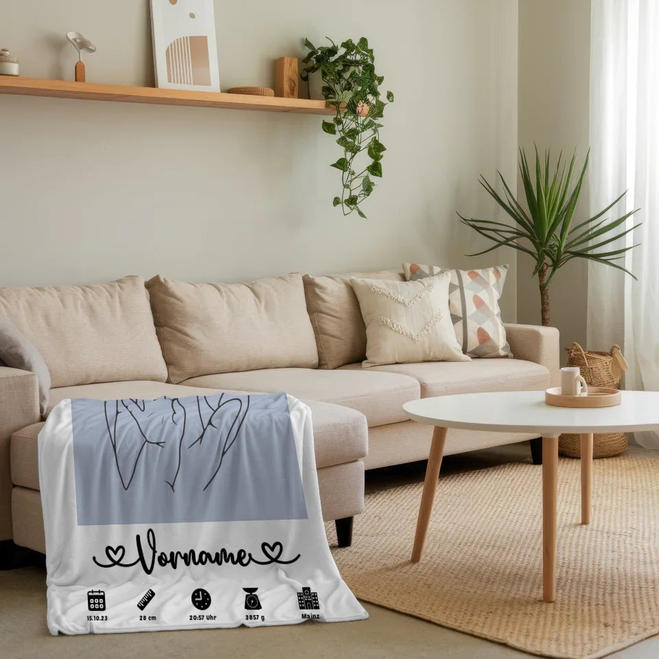 Personalisierte Decke Geburt mit Geburtsdaten Hände Lineart Blau Pastell