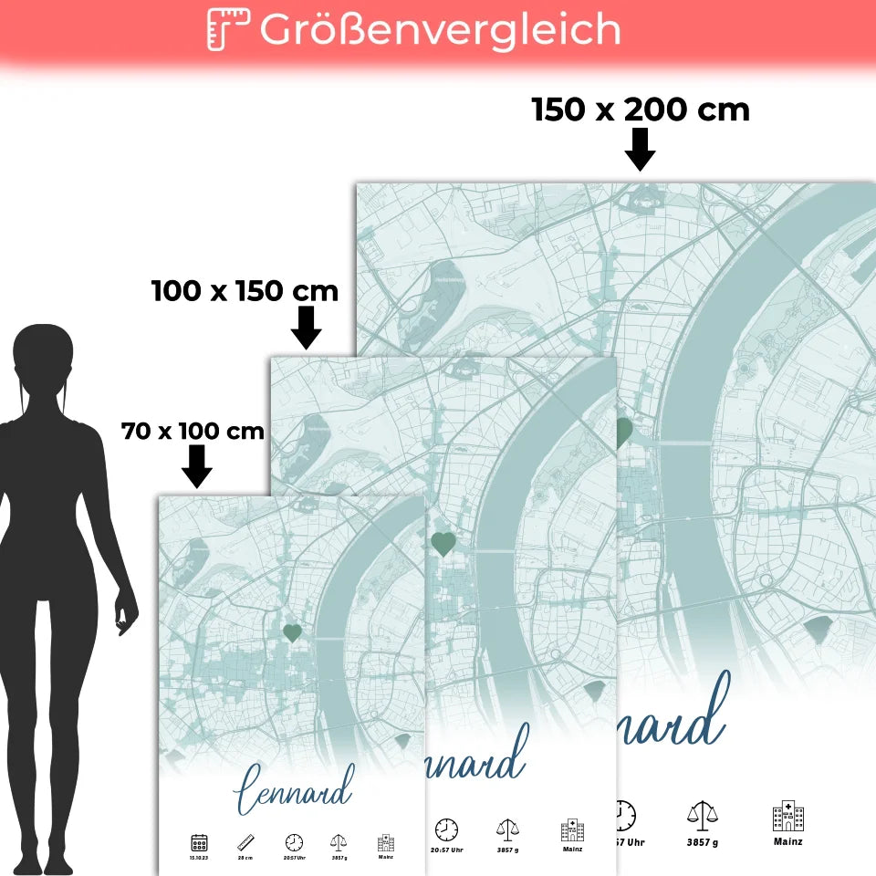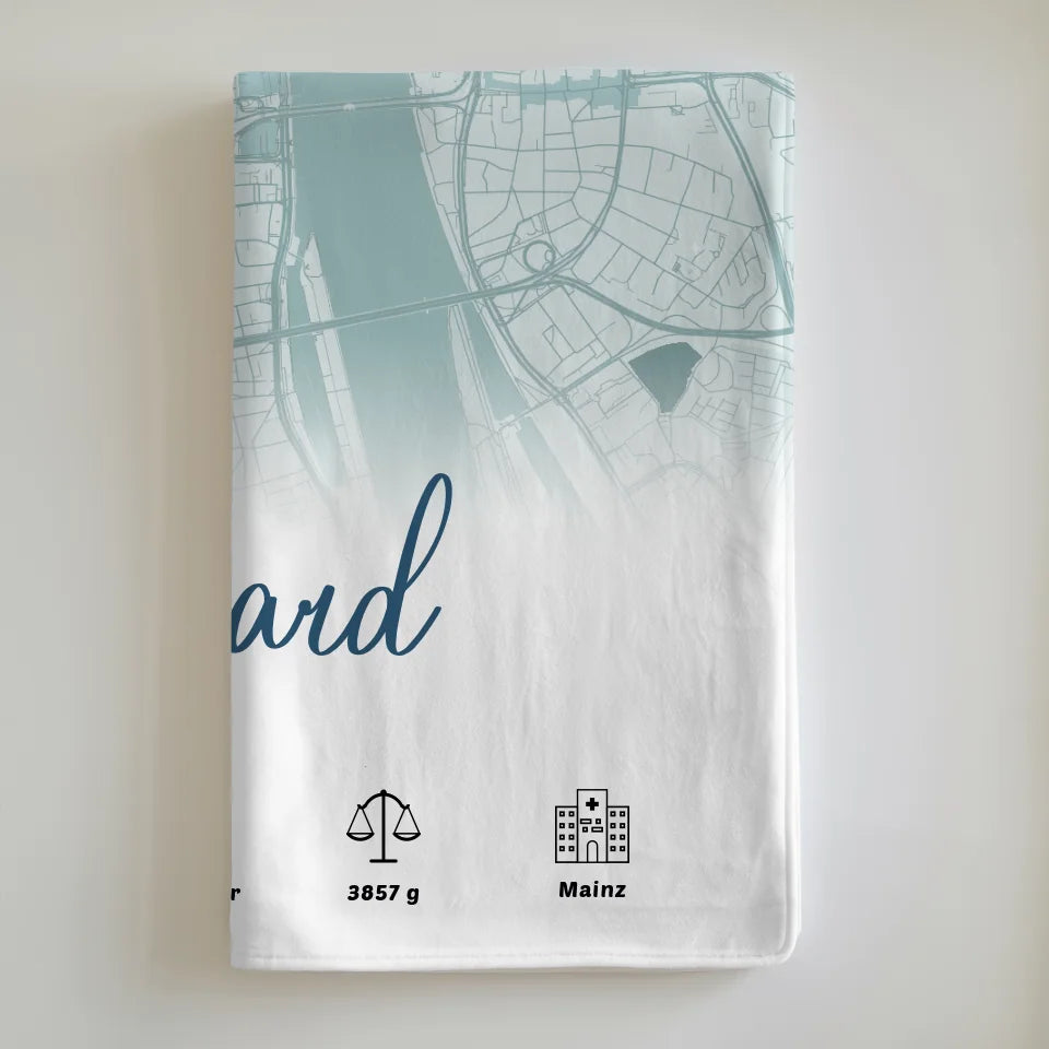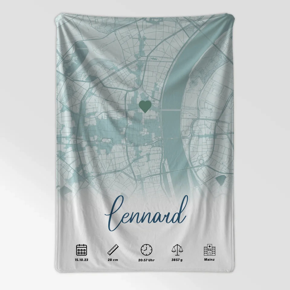 Du kannst die Karte mit dem besonderen Ort, an dem Dein Junge das Licht der Welt erblickt hat, individuell gestalten. Füge die Geburtsdaten wie Gewicht, Größe, Uhrzeit und Datum hinzu, sowie den Namen Deines Kindes, um die Decke zu einem echten Unikat zu machen. Diese liebevoll gestaltete Decke ist das ideale Geschenk zum Geburtstag oder eine wunderbare Erinnerung an die Geburt.