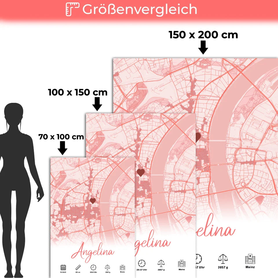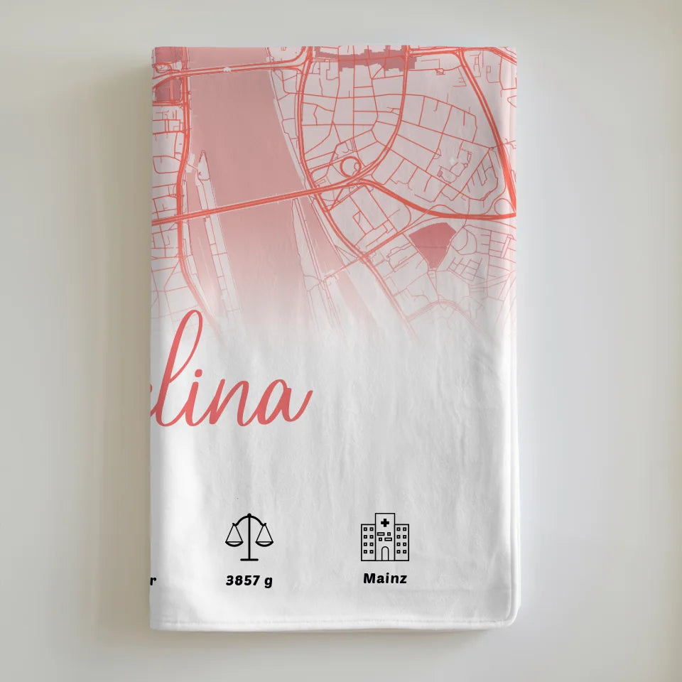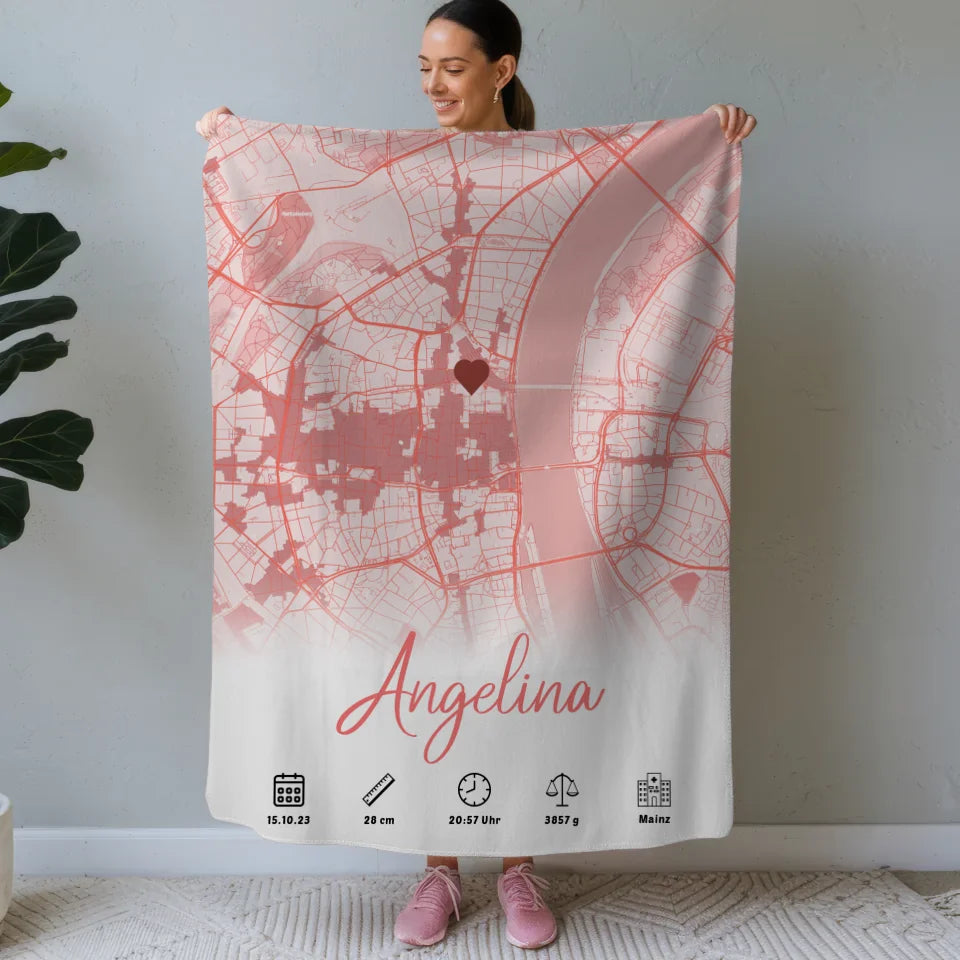 Gestalte jetzt Deine eigene Decke Geburt und verschenke ein wunderbares Stück, das die Herzen erobert. Diese personalisierte Decke ist ein ideales Geschenk, das ebenso einzigartig ist wie das neugeborene Mädchen selbst. Mache den besonderen Tag unvergesslich mit unserer Stadtkarte und den dazugehörigen Geburtsdaten. Bestelle jetzt und erlebe, wie einfach es ist, ein ganz persönliches und liebevolles Geschenk zu kreieren!