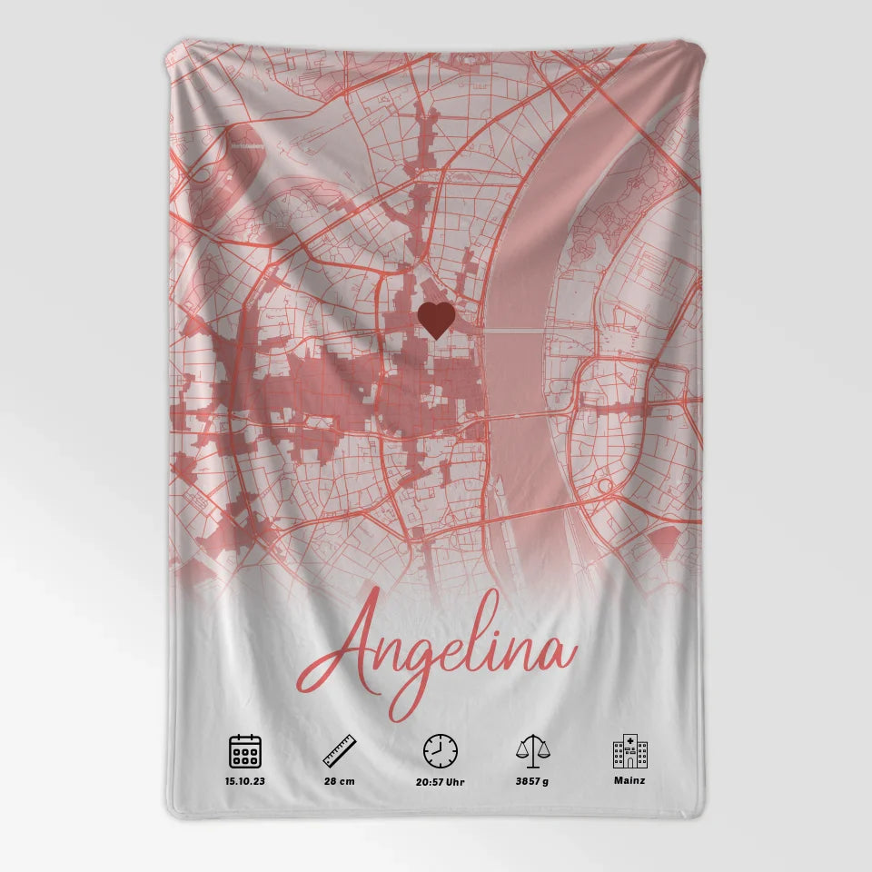 Personalisierte Decke Geburt Stadtkarte Rot mit Geburtsdaten Mädchen